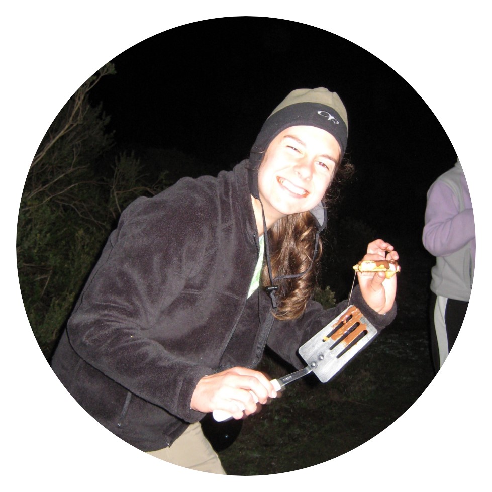 | Angela studied water, hands, and health in developing countries. In the picture at the right, she is making a biscuit on a stick while camping. She is currently a teaching fellow at Stanford for the Thinking Matters program. |
