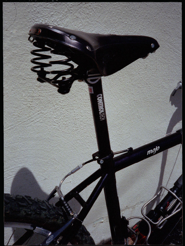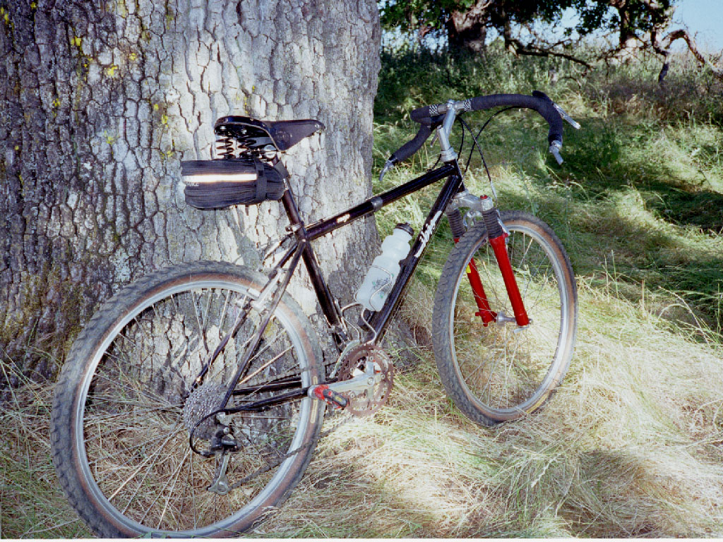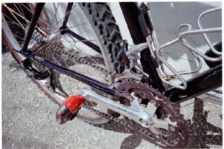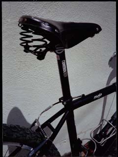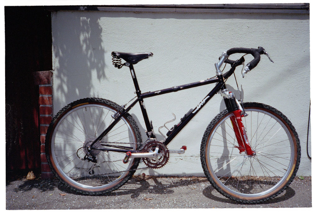 Frame: Ibis Mojo Fork: Marzocchi Z2 Bomb, 1998, threaded (I also don't like threadless) Headset: Shimano XT Stem: Something from Specialized that Nashbar had on sale Handlebars: The afore-mentioned WTB Off-Road Drop Tape: One of those non-adhesive ones that are easy to re-wrap Brake levers: Dia-Compe 287V Shift Levers: Ultegra 8sp indexed Seatpost: Control Tech (Ibis uses a strange size, not many fit it) Saddle: Brooks Champion Flyer Bottom Bracket: Phil Wood Cranks: Suntour XC-Pro, 24-36-46 Pedals: Look S2R Moab Front D.: Sachs Quarts (not as shown, that's a Suntour XC Pro in the pic) Rear D.: Shimano LX Chain: Some sachs/Sedis thing Hubs: Shimano XTR, older style that SuperGo had on sale as whole wheels, 36h Spokes: DT 2.0mm Rims: WTB Laser Beam Tires: Continental Cross-Country Brakes: Avid, 20 or 25, can't remember, very nice though Bottle Cages: Performance stainless steel, Italan made Countries represented: US, Italy, England, Germany, Taiwan, Japan, France, Switzerland (that I know of).News Flash: (2/28/02) Ibis has declared chapter 7 bankruptcy. They're toast, gone, dead, hasta la vista baby and all that. No mo' mojos. I guess this bike becomes a "cold dead fingers" bike now. Bummer.