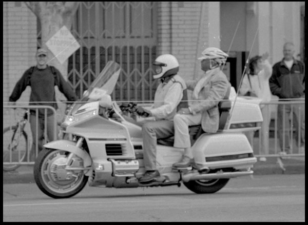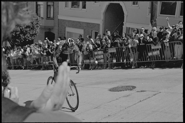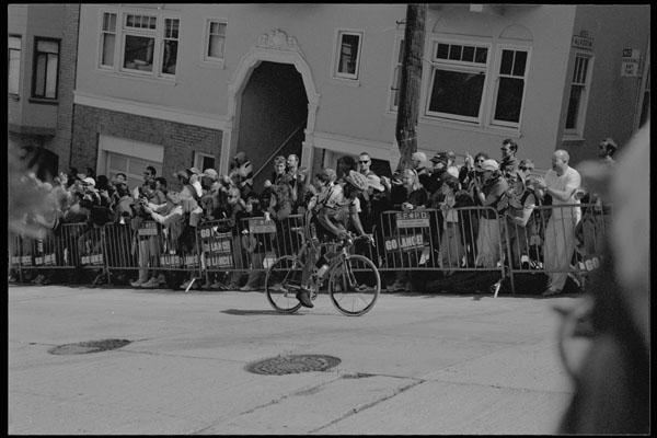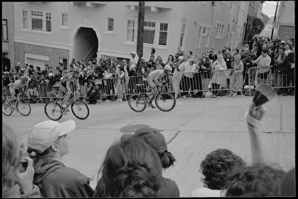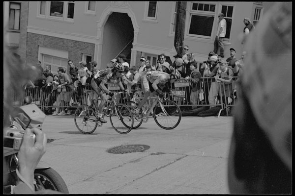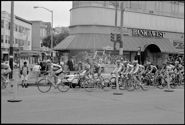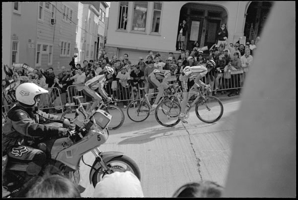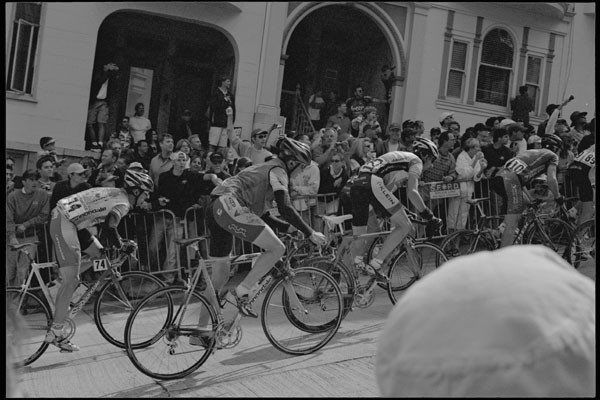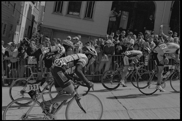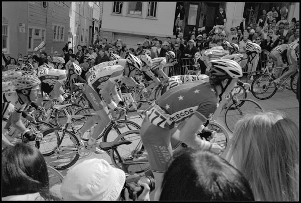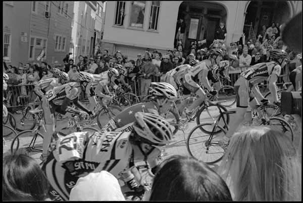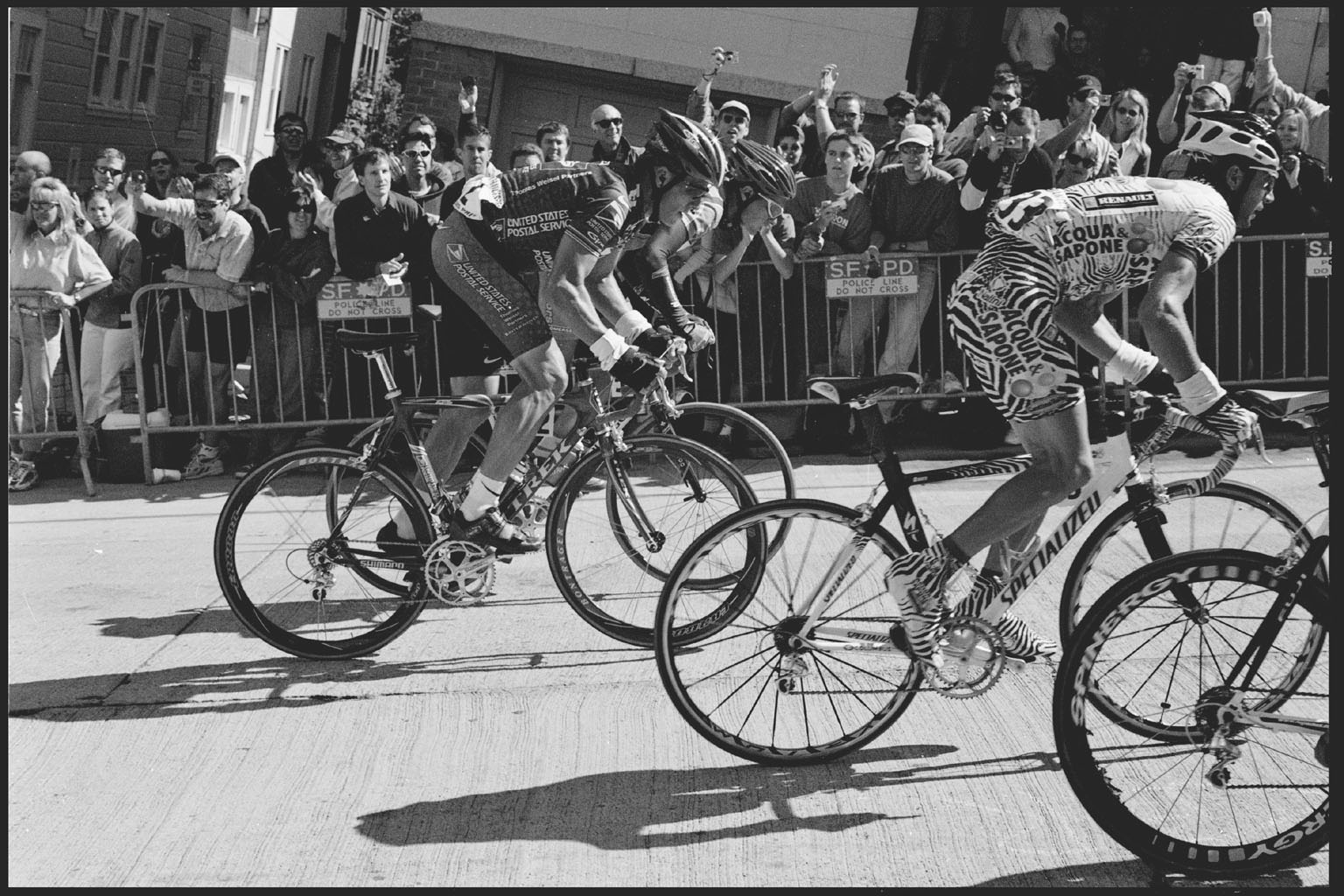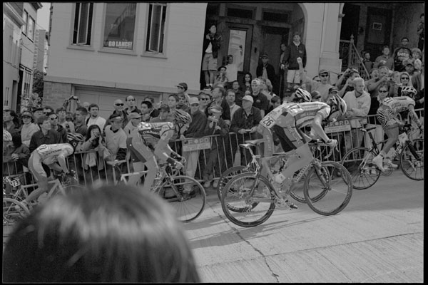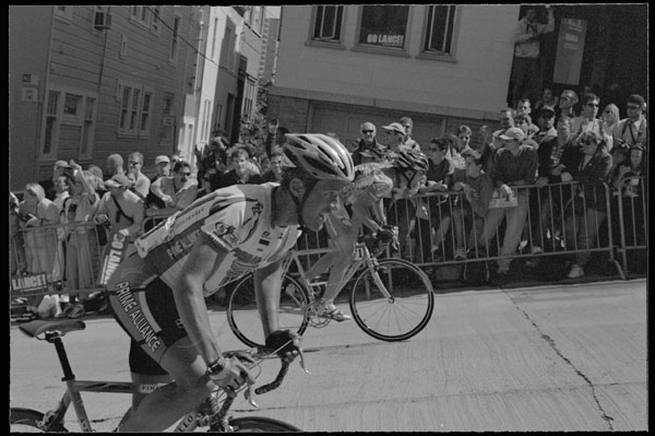 After two SF Grand Prixes and 8 rolls of film, I finally get a decent picture of Lance! Here's a larger version. With him are Massimo Giunti (33) and another rider that I can't identify. |