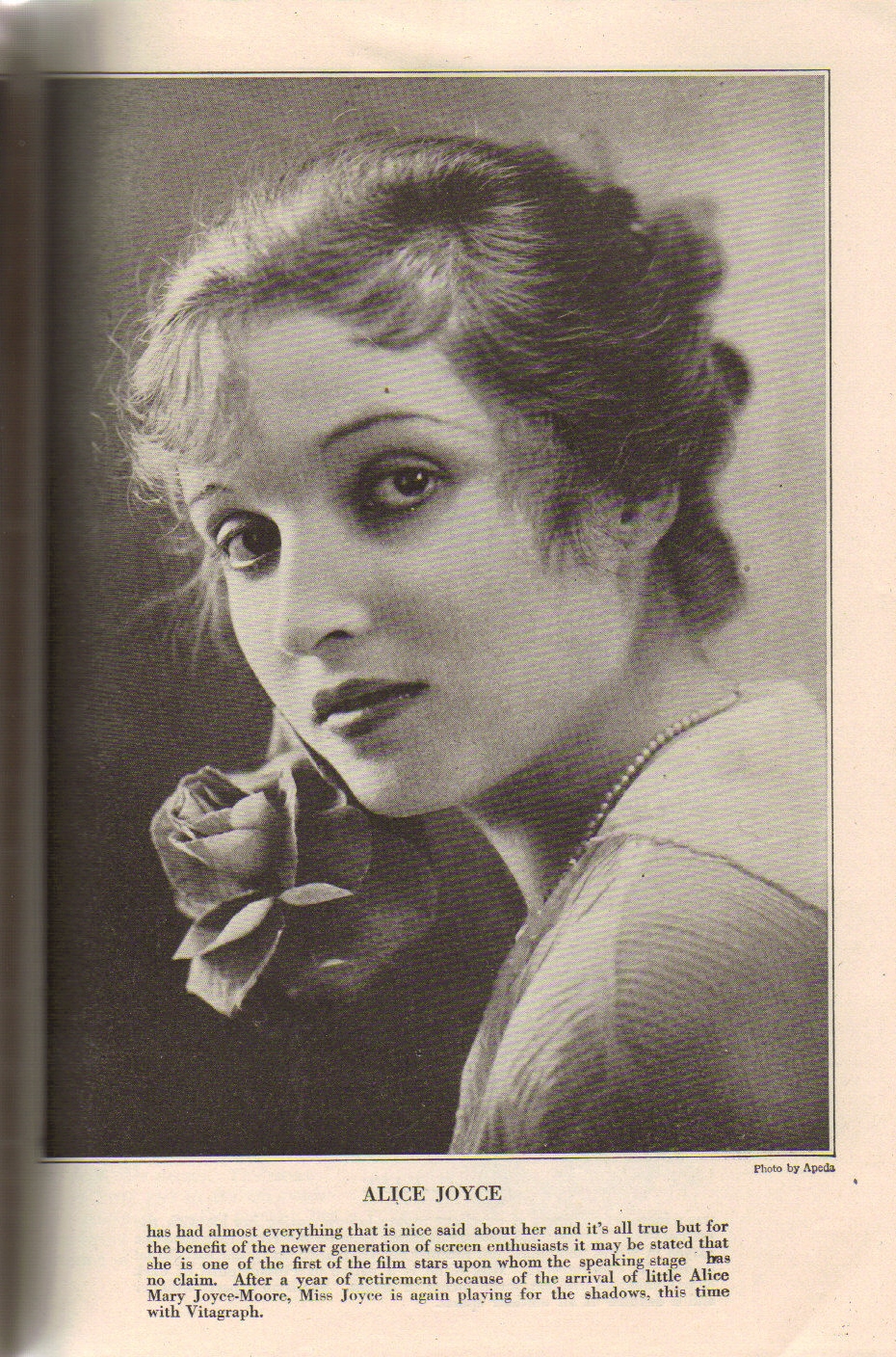| A portrait by Pach Bros, N.Y., which has a written caption "Alice Joyce who will return to the screen in Gasnier's Production - White Man, A Preferred Picture, Presented by B.P. Schulberg". |