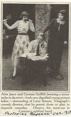 A clipping featuring a gag photo of Alice Joyce, Corinne Griffith with Larry Semon, from Photoplay, Dec. 1917, courtesy of Randy Bigham |