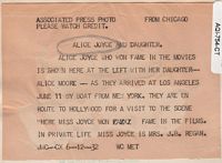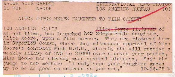 A picture of Alice Joyce and her daughter Alice Moore, who was signing a movie contract in 1935. On the right is the snipe on the back. |  |