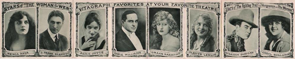 parts visible when folded are for the serial The Woman in the Web but the interior features many Vitagraph stars. The inside and outside are shown below unfolded |