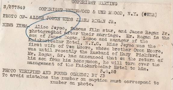 Alice Joyce with second husband James Regan from 1920. On the right is the snipe on the back. |  |