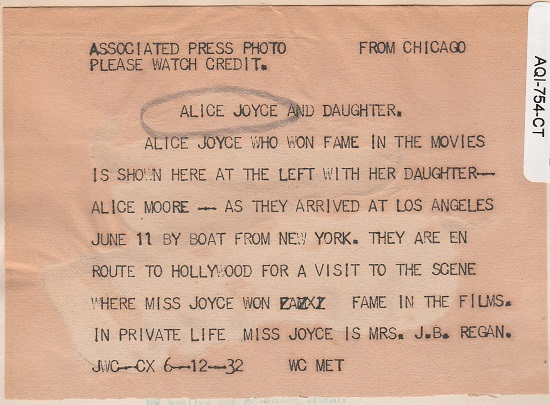Alice Joyce with daughter Alice Moore in 1932. On the right is the snipe on the back. |  |