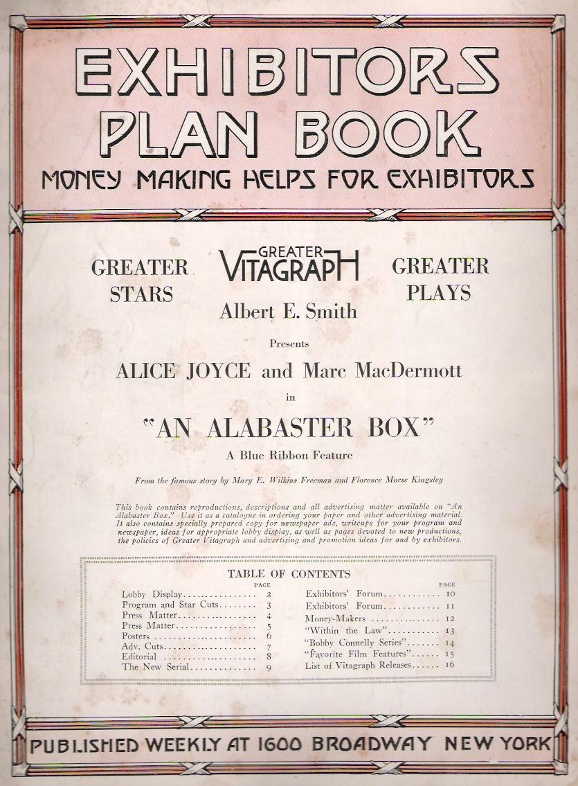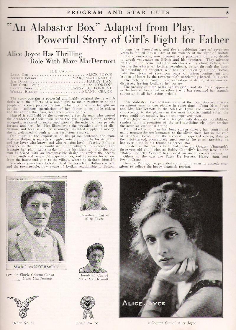 An Alabaster Box (1917) Vitagraph Co. of America. A Blue Ribbon Feature. Distributor: Greater Vitagraph (V.L.S.E., Inc). Director: Chester Withey. Scenario: A. Van Buren Powell Cast: Alice Joyce, Marc MacDermott, Harry Ham, Aida Horton, Patsey De Forest, Frank Crane. 5 reels. This film appears to be LOST