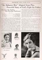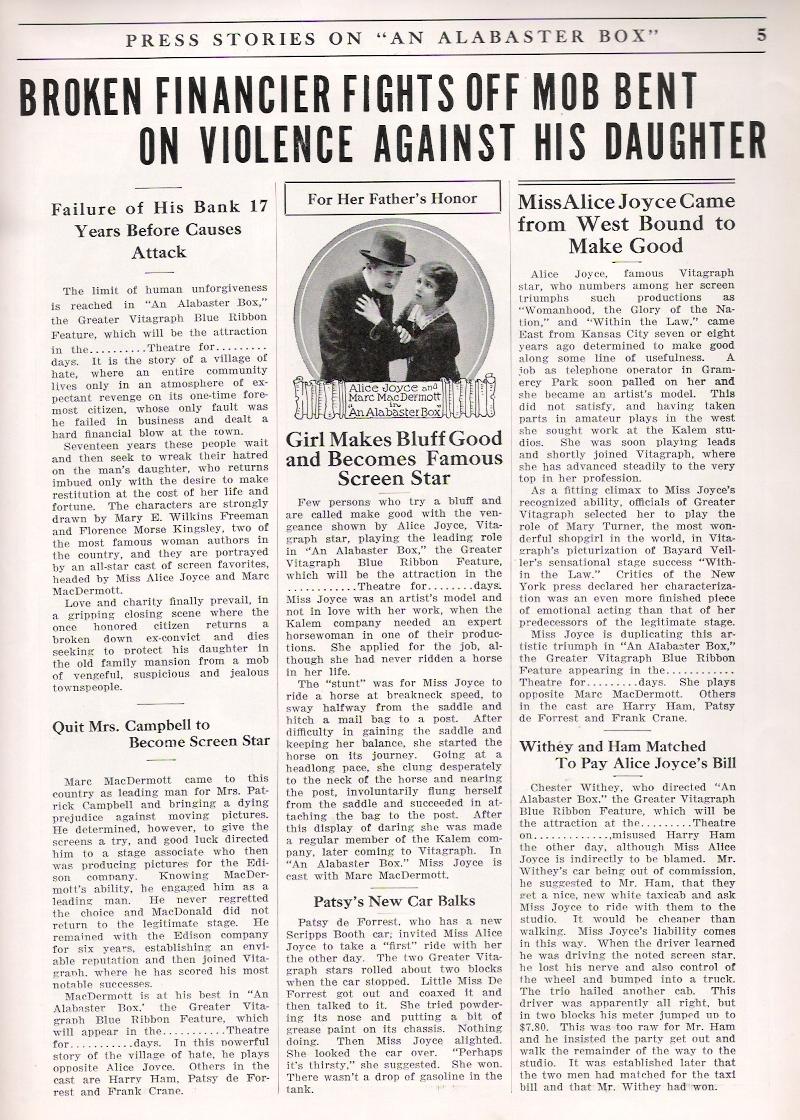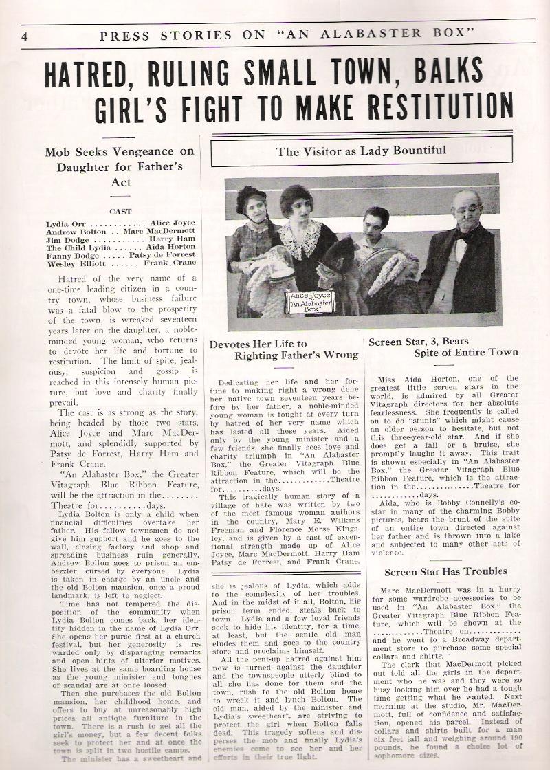AN ALABASTER BOX (Five Parts--Sept. 10.)--The cast: Lydia Orr (Alice Joyce); Harry Bolton (Marc MacDermott); Jim Dodge (Harry Ham); The Child Lydia (Aide Horton); Fanny Dodge (Patsy De Forest); Wesley Elliott (Frank Crane); Authors, Mary E. Wilkins Freeman and Florence Morse Kingsley. Director, Chester Withey.