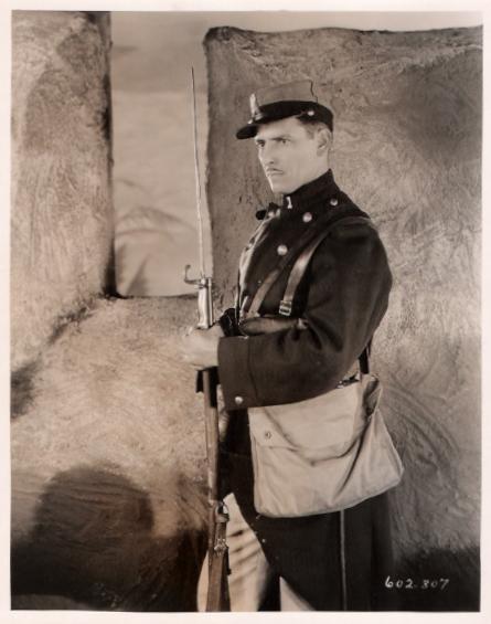 The next jump is to the barracks of the Foreign Legion's receiving post in France, where John, having joined, sees Beau and Digby already in uniform. Here the trio come across the despicable Lejaune, who breaks up the combination by dispatching Beau and John to a desert fort and keeps Digby behind. Lejaune is after the diamond, having forced the information from Boldini, a private, caught in the act of snatching Beau's money belt after overhearing the brothers still chafing each other about the Blue Water. Boldini has his hands pierced by bayonets for the attempt, a gruesome spectable [sic], but excellently played by William Powell.