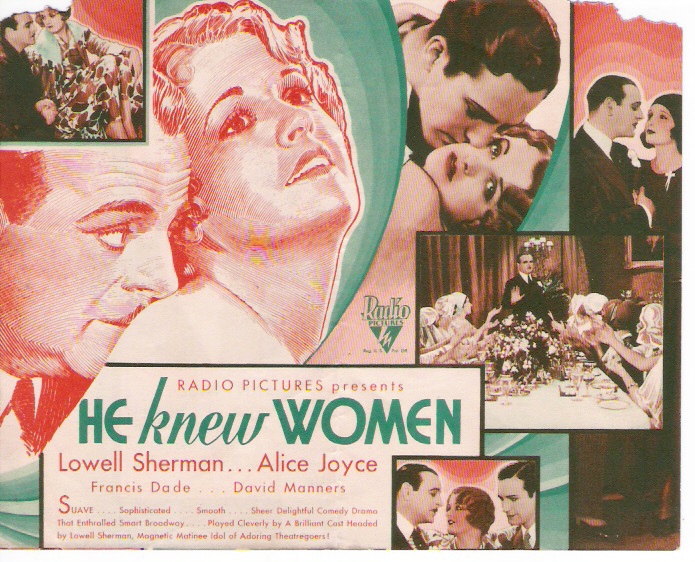 He Knew Women (1930) RKO Productions. Producer: William Le Baron. Associate Producer: Myles Connolly. Director: Hugh Herbert, Lynn Shores. Screenplay: William B. Jutte, Hugh Herbert. Photography: Edward Cronjager. Art Director: Max Ree. Editor: Ann McKnight, George Marsh. Recording engineer: Lambert E. Day. Cast: Lowell Sherman, Alice Joyce, David Manners, Frances Dade. 6,317 ft.