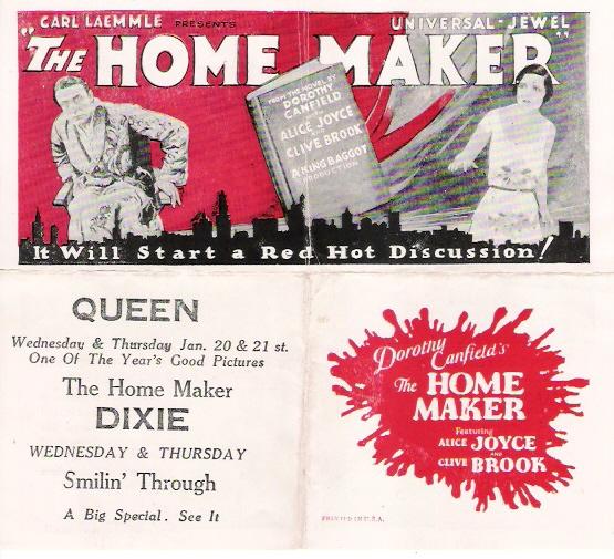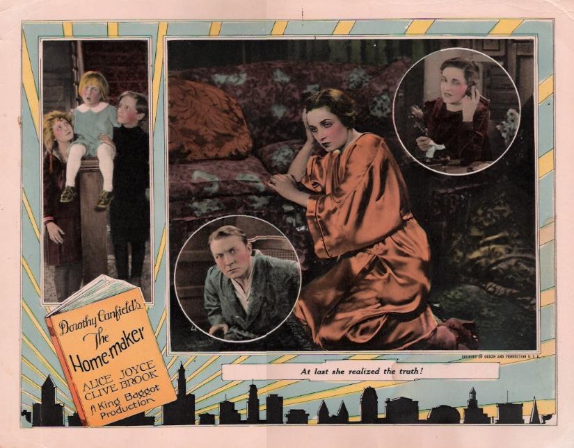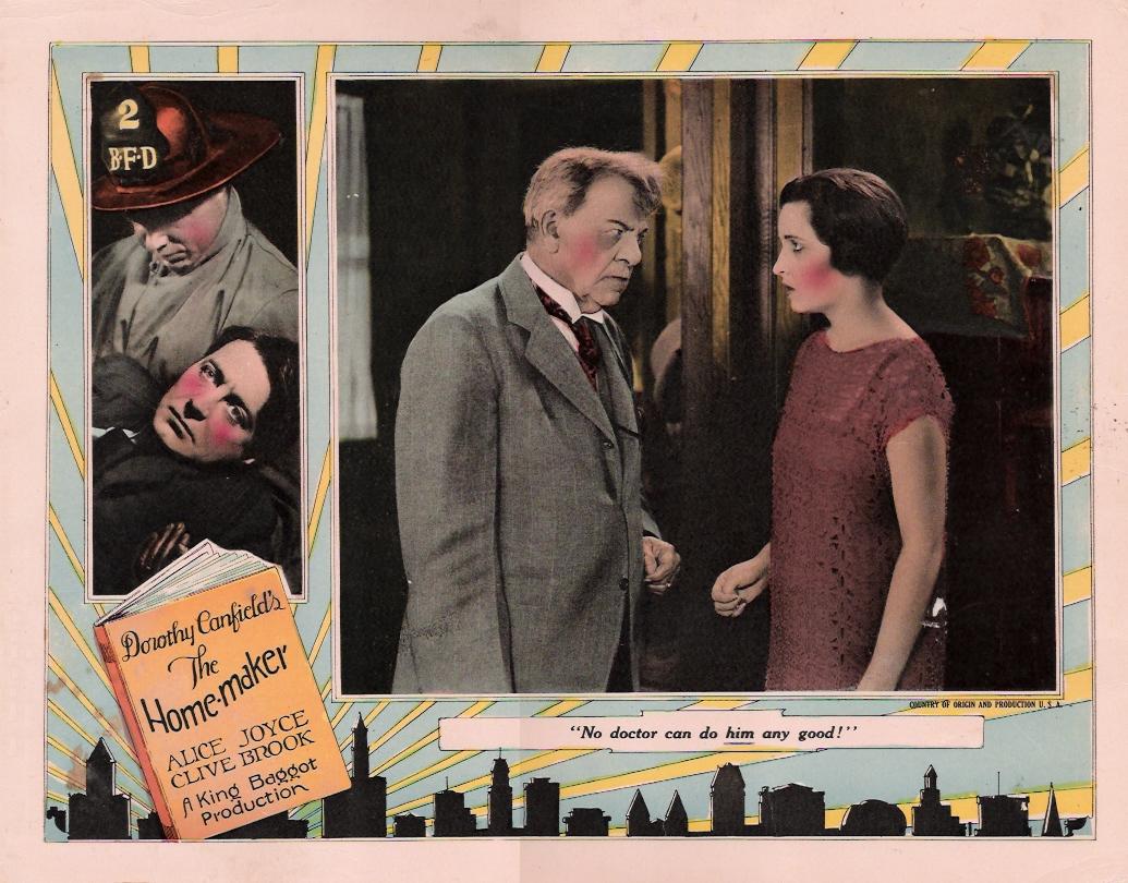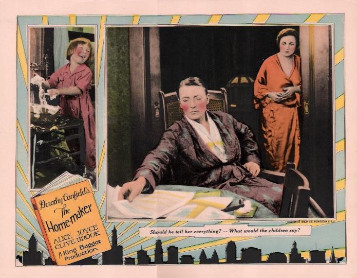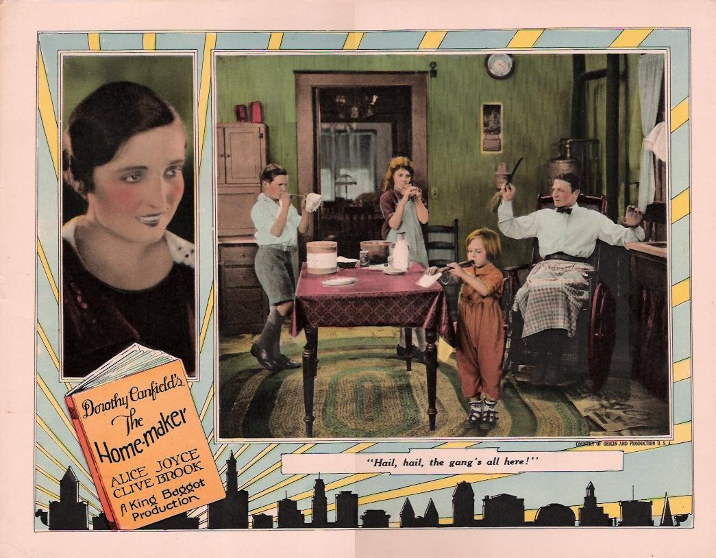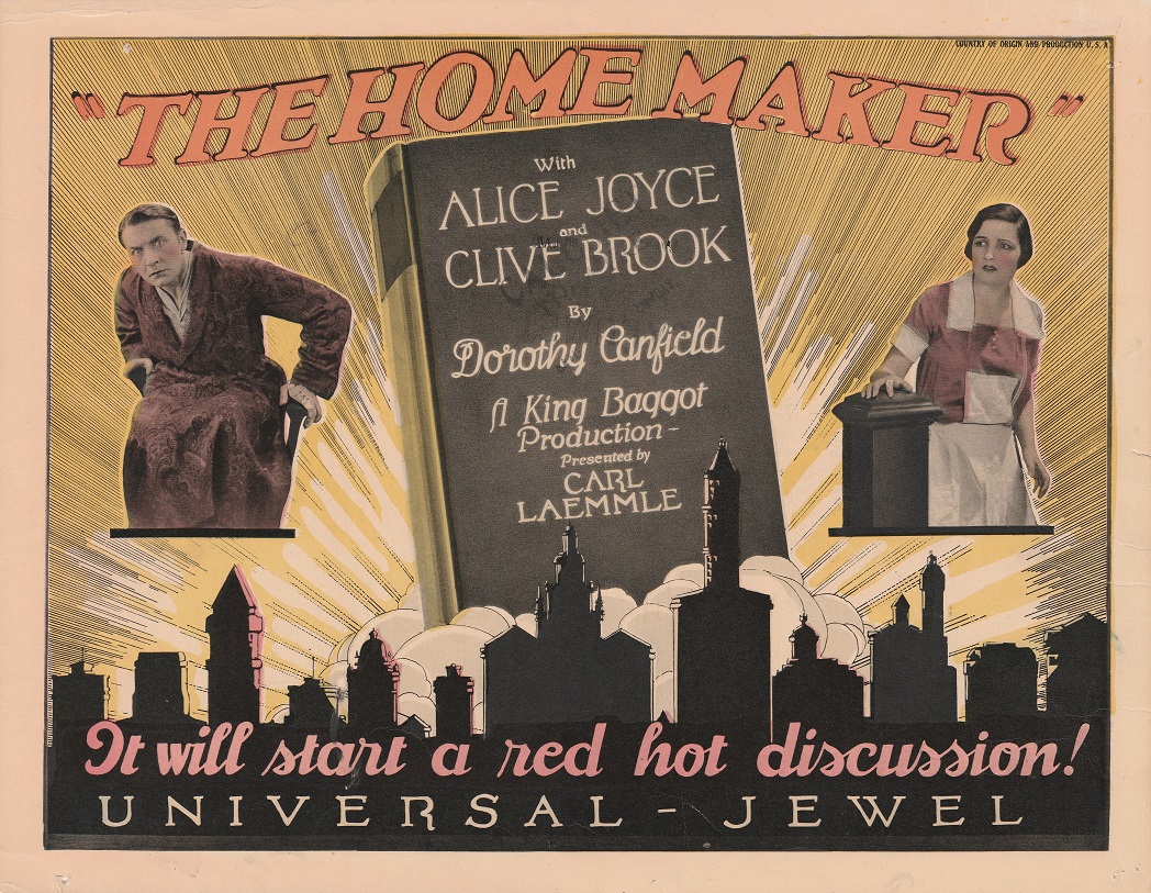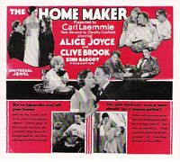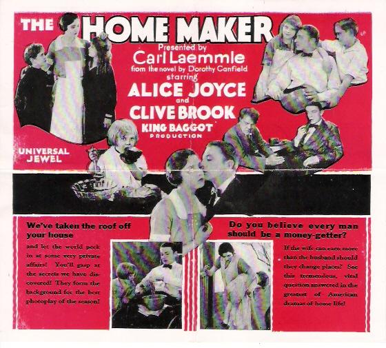 The Home Maker (1925) Universal Pictures. Director: King Baggot. Scenario: Mary O'Hara. Photography: John Stumar. Cast: Alice Joyce, Clive Brook, Billy Kent Schaeffer, George Fawcett, Virginia Boardman, Maurice Murphy, Jacqueline Wells, Frank Newburg, Margaret Campbell, Martha Mattox, Alfred Fisher, Alice Flower, Elaine Ellis. 8 reels, 7,755 ft.