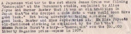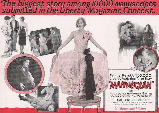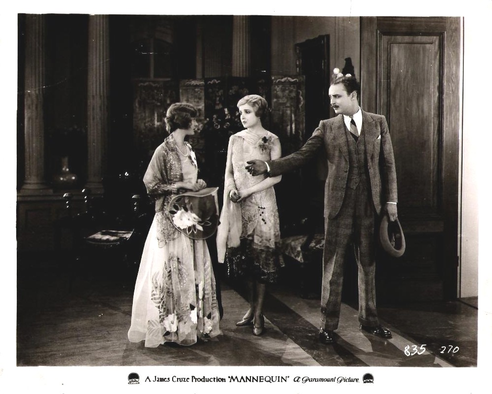 Mannequin (1926) Famous Players-Lasky. Distributor: Paramount Pictures. Presenters: Adolph Zukor, Jesse L. Lasky. Director: James Cruze. Screenplay: Frances Agnew. Adaptation: Walter Woods. Photography: Karl Brown. Cast: Alice Joyce, Warner Baxter, Dolores Costello, ZaSu Pitts, Walter Pidgeon, Freeman Wood, Charlot Bird. 7 reels, 6,981 ft.