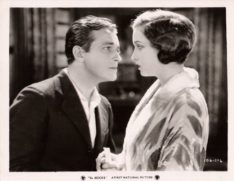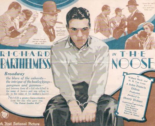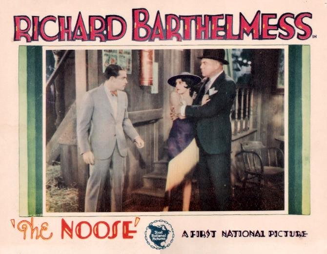 The Noose (1928) First National Pictures. Presenter: Richard A. Rowland. Producer: Henry Hobart. Director: John Francis Dillon. Screenplay: H.H. Van Loan, Willard Mack. Adaptation-Continuity: James T. O'Donohoe. Titles: Garrett Graham. Photography: James C. Van Trees. Editor: Jack Dennis. Cast: Richard Barthelmess, Montague Love, Robert E. O'Connor, Jay Eaton, Lina Basquette, Thelma Todd, Ed Brady, Fred Warren, Charles Giblyn, Alice Joyce, William Walling, Robert T. Haines, Ernest Hilliard, Emile Chautard, Romaine Fielding, Yola D'Avril, Corliss Palmer, Kay English, Cecil Brunner, Janice Peters, Ruth Lord, May Atwood. 8 reels, 7,331 ft.