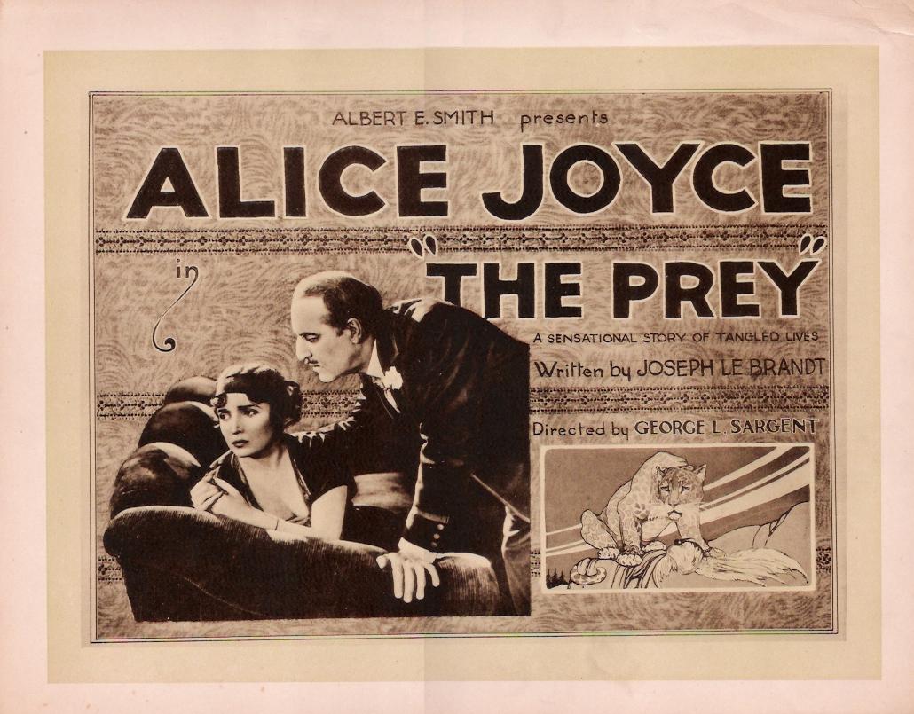 The Prey (1920) Vitagraph Co. of America. A Vitagraph Special Production. Distributor: Vitagraph Co. of America. Presenter: Albert E. Smith. Director: George L. Sargent. Scenario: Calder Johnstone. Story: Joseph Le Brandt. Camera: Joe Shelderfer. Gowns by Lucile. Cast: Alice Joyce, Henry Hallam, Jack McLean, Harry Benham, L. Rogers Lytton Herbert Pattee, William Turner, Cecil Kern, Roy Applegate. 6 reels This film appears to be LOST
