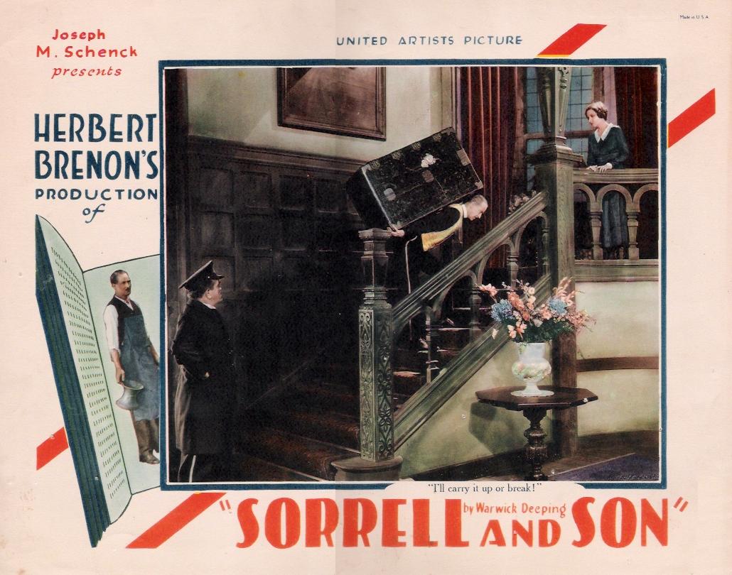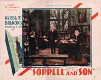 Sorrell and Son (1927) Feature Productions. Distributor: United Artists. Presenter: Joseph M. Schenck. Director-Scenario: Herbert Brenon. Adaptation: Elizabeth Meehan. Photography: James Wong Howe. Set Design: Julian Boone Fleming. Editor: Marie Halvey. Assistant Director: Ray Lissner. Makeup: Fred C. Ryle. Cast: H.B. Warner, Anna Q. Nilsson, Mickey McBan, Carmel Myers, Lionel Belmore, Norman Trevor, Betsy Ann Hisle, Louis Wolheim, Paul McAllister, Alice Joyce, Nils Asther, Mary Nolan. 10 reels, 9,900 ft.