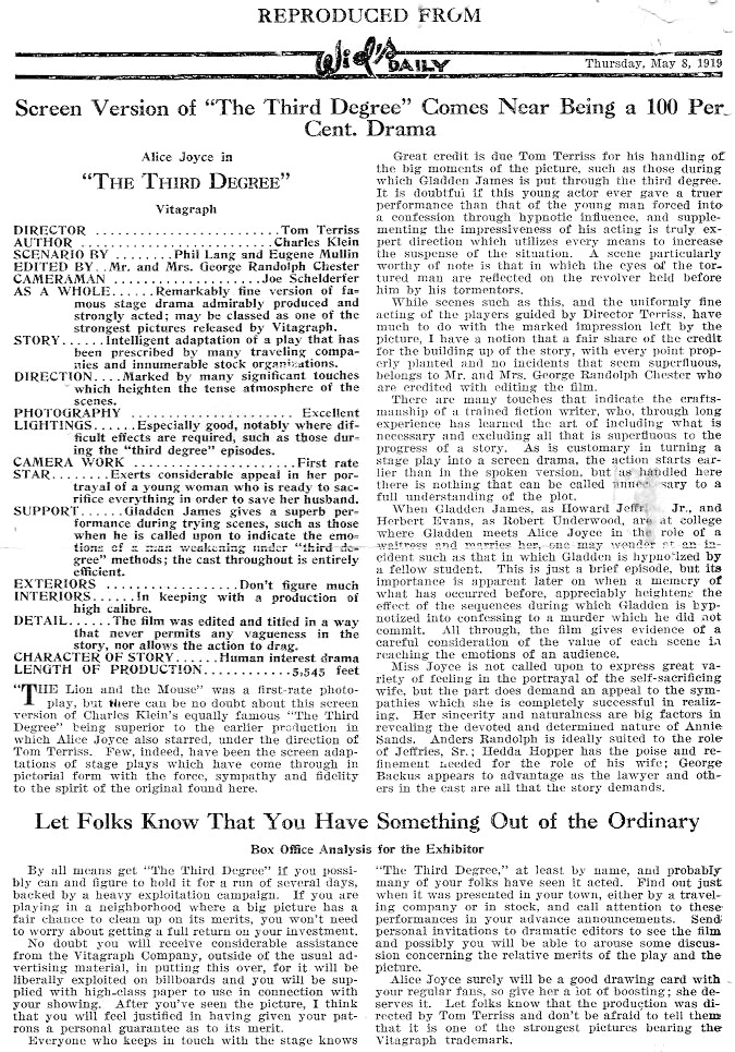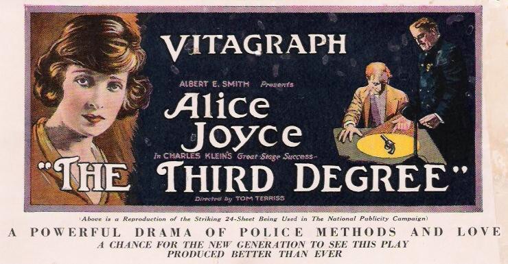 The Third Degree (1919) Vitagraph Co. of America. Distributor: Vitagraph Co. of America. Director: Tom Terriss. Scenario: Phil Lang and Eugene Mullin. Scenario Editor: George Randolph Chester and Mrs. George Randolph Chester. Camera: Joe Shelderfer. Cast: Alice Joyce, Gladden James, Anders Randolf, Hedda Hopper, Herbert Evans, George Backus, John P. Wade, L. Rogers Lytton, Edward McGuire. 6-7 reels This film appears to be LOST