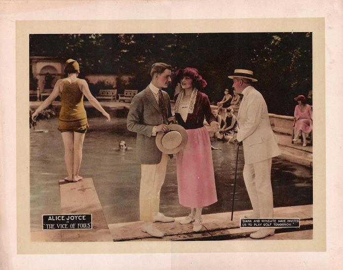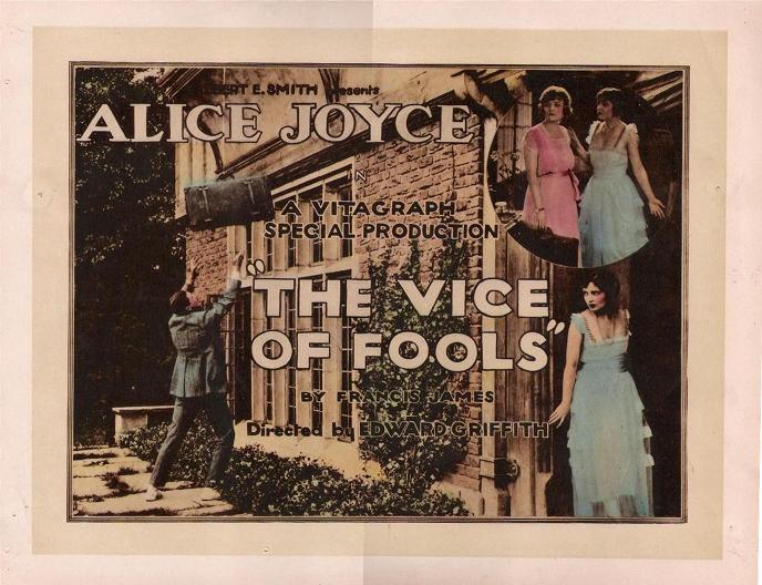 The Vice of Fools (1920) Vitagraph Co. of America. Distributor: Vitagraph Co. of America; Alice Joyce Productions. Director: Edward Griffith. Assistant director, John William Evans. Scenario: C. Graham Baker. Story: Francis James. Camera: Joe Shelderfer. Cast: Alice Joyce, Ellen Cassity, Robert Gordon, Raymond Bloomer, William Tooker, Elizabeth Garison, Agnes Everett. 5 reels This film appears to be LOST