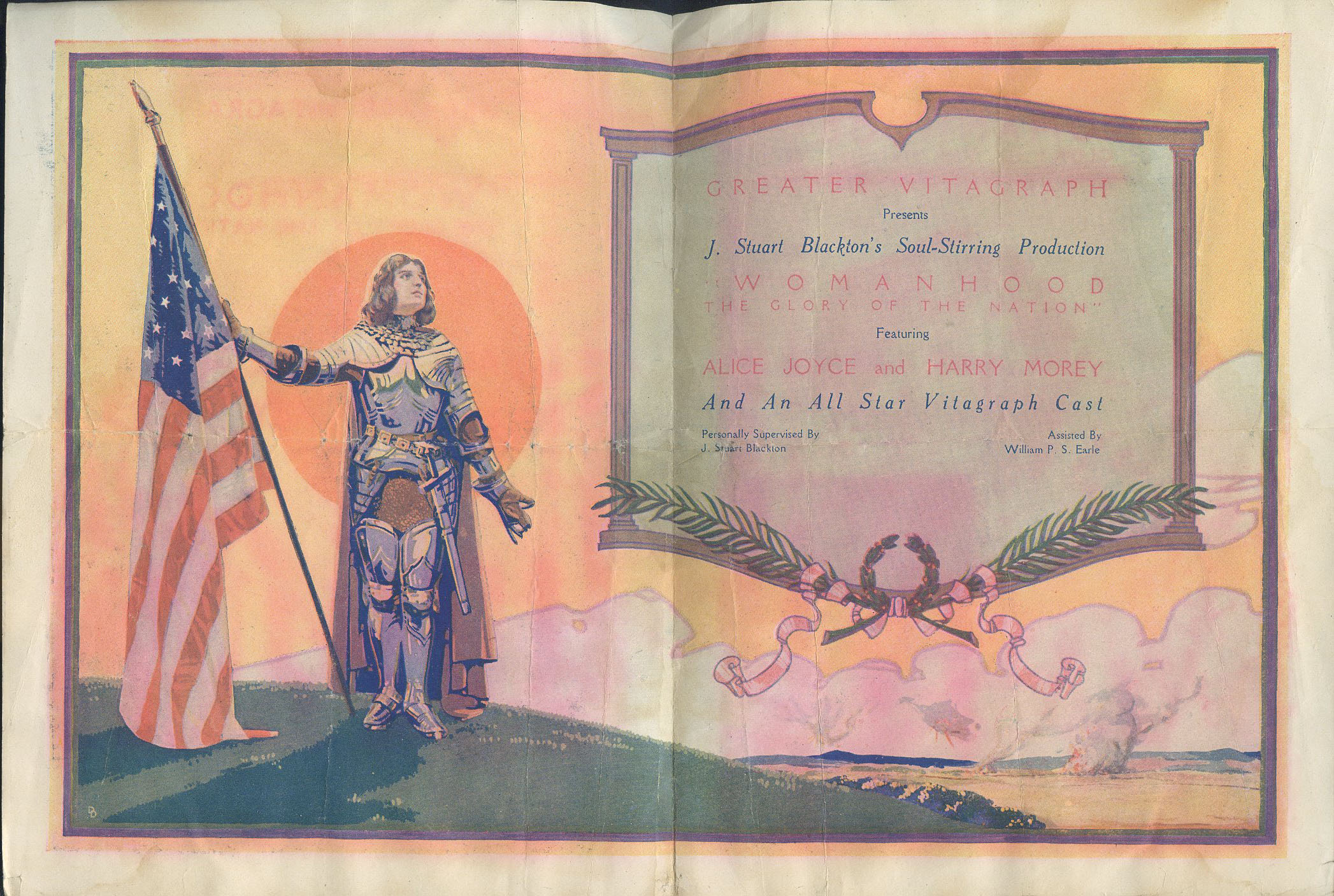Womanhood, the Glory of the Nation (1917) Vitagraph Co. of America. A Vitagraph Special. Distributor: Greater Vitagraph (V.L.S.E., Inc) Supervisor: J. Stuart Blackton. Producers: J. Stuart Blackton and Albert E. Smith. Director: J. Stuart Blackton and William P.S. Earle. Scenario: Helmer W. Bergman. Story: J. Stuart Blackton and Cyrus Townsend Brady. Camera: Clark R. Nickerson. Editor: Albert J. Ohlson. Artistic effects: Ferdinand Earle. Military advisor: Captain George W. Johnston. Pyrotechnician: Herman Rottger. Cast: Alice Joyce, Harry T. Morey, Naomi Childers, Joseph Kilgour, Walter Mcgrail, Mary Maurice, James Morrison, Peggy Hyland, Templar Saxe, Bobby Connelly, Edward Elkas, Bernard Siegel, John Costello, Theodore Roosevelt. 7 reels This film appears to be LOST