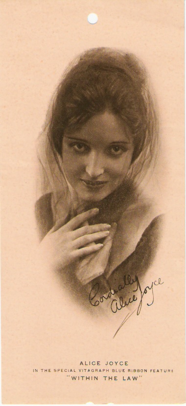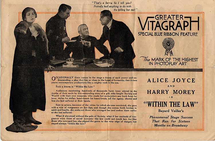 Within the Law (1917) Vitagraph Co. of America. A Special Blue Ribbon Feature. Distributor: Greater Vitagraph (V.L.S.E., Inc). Supervisor: J. Stuart Blackton. Director: William P.S. Earle. Scenario: Eugene Mullin. Camera: Clark R. Nickerson. Editor: Viola Mallort. Artistic effects, Ferdinand Early. Musical accompaniment arranged by S.M. Berg. Cast: Alice Joyce, Harry T. Morey, Adele de Garde, Anders Randolf, Walter McGrail, Eugene O'Rourke, Billie Billings, Miss Bunce, Joe Donohue, Bernard Randall, Bernard Siegel, Robert Gaillard, Victor A. Stewart. 9 reels. This film appears to be LOST
