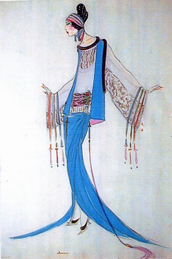 | Over a foundation of flesh coloured charmeuse, Lucile has allowed her fancy to play along lines that are Florentine, but with a thought for the Orient in a combination of black and silver. A chemise of black chiffon slips on over the head and is draped at the side. The long loose sleeves, which are finished with silver tassels, form one piece across the front and back of the tea-gown. [Photograph, Baron de Meyer] | |