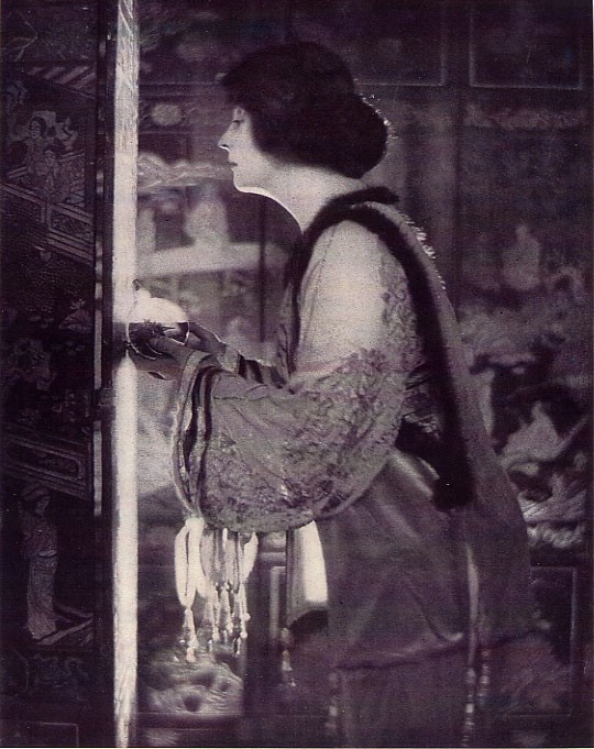 | Another view of the blue fur-trimmed tea gown from the film, which appeared in Photoplay, October, 1918, photographed by Baron de Meyer | |