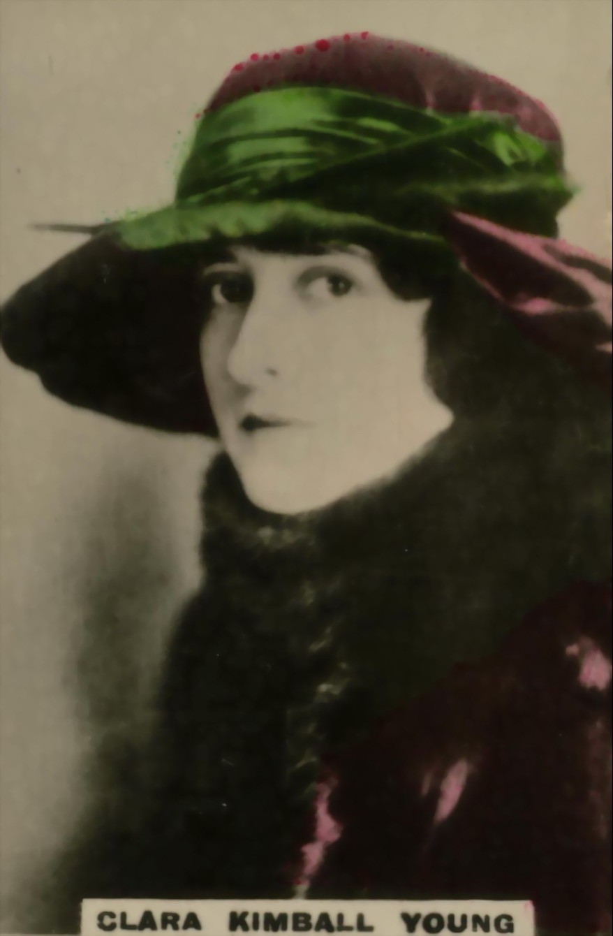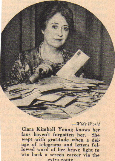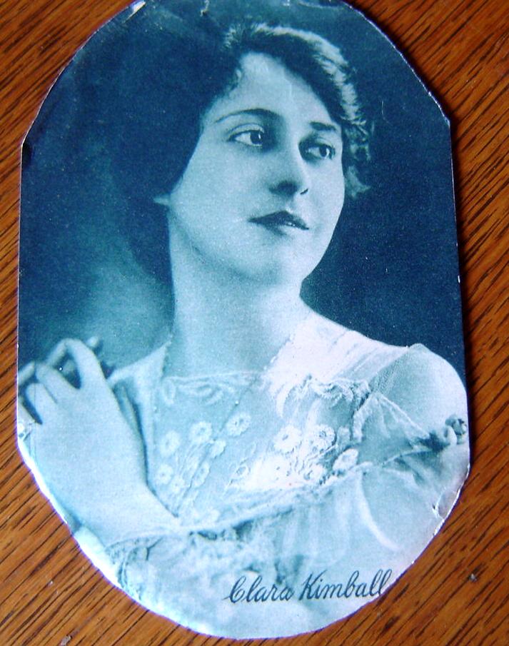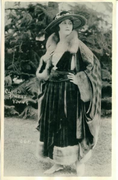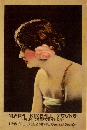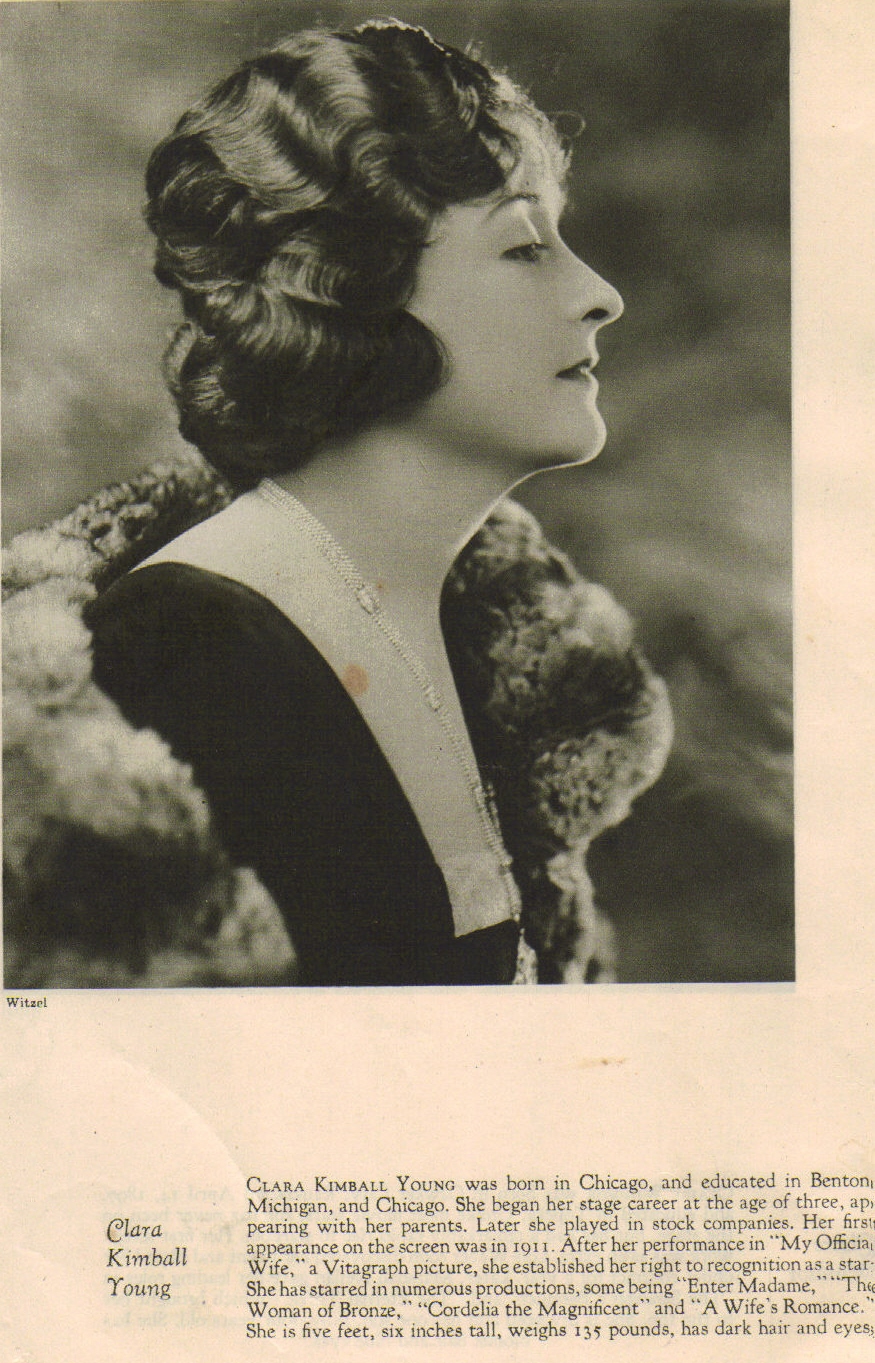 Clara apparently on the set of The Crusades with Cecil B. DeMille. As far as i know, nobody has yet spotted her in the film. The snipe on the back reads: BACK IN THE LIMELIGHT - Once Hollywood's most famous film star, Clara Kimball Young is back at work in character parts. Cecil B. DeMille, pioneer director, cast her in a role in his current Paramount production "The Crusades". Here they are talking ove old times between scenes on the set. | A nice portrait from rom Pat Wilson, who found it under a picture frame. | ||