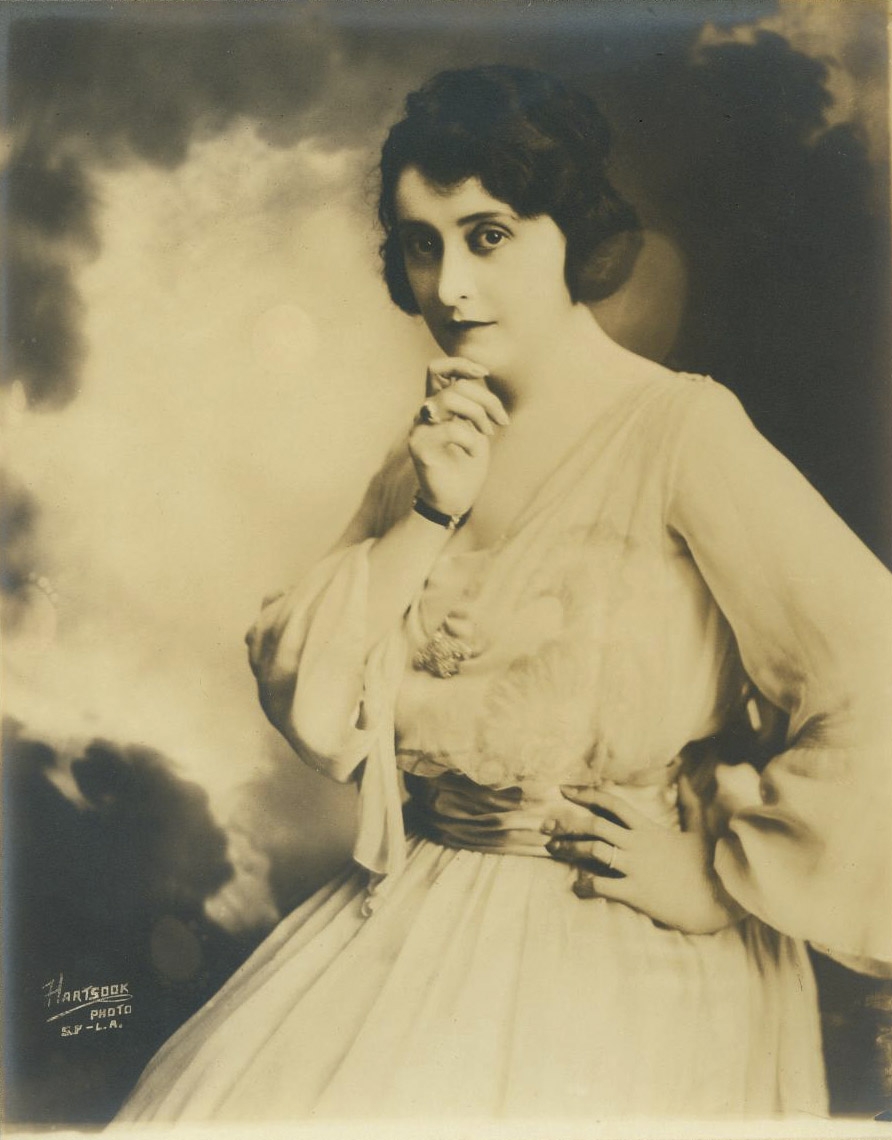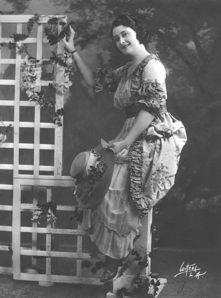 I had assumed this was a portrait in costume from Enter Madame (1922) because the dress looks like the one in a still from the film. However, another picture from this Witzel photo session appeared in the Wid's Yearbook 1919-1920, and Randy Bigham has identified the gown as a Lucile design first seen in The Road though the Dark in 1918, as seen here | |