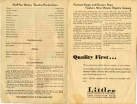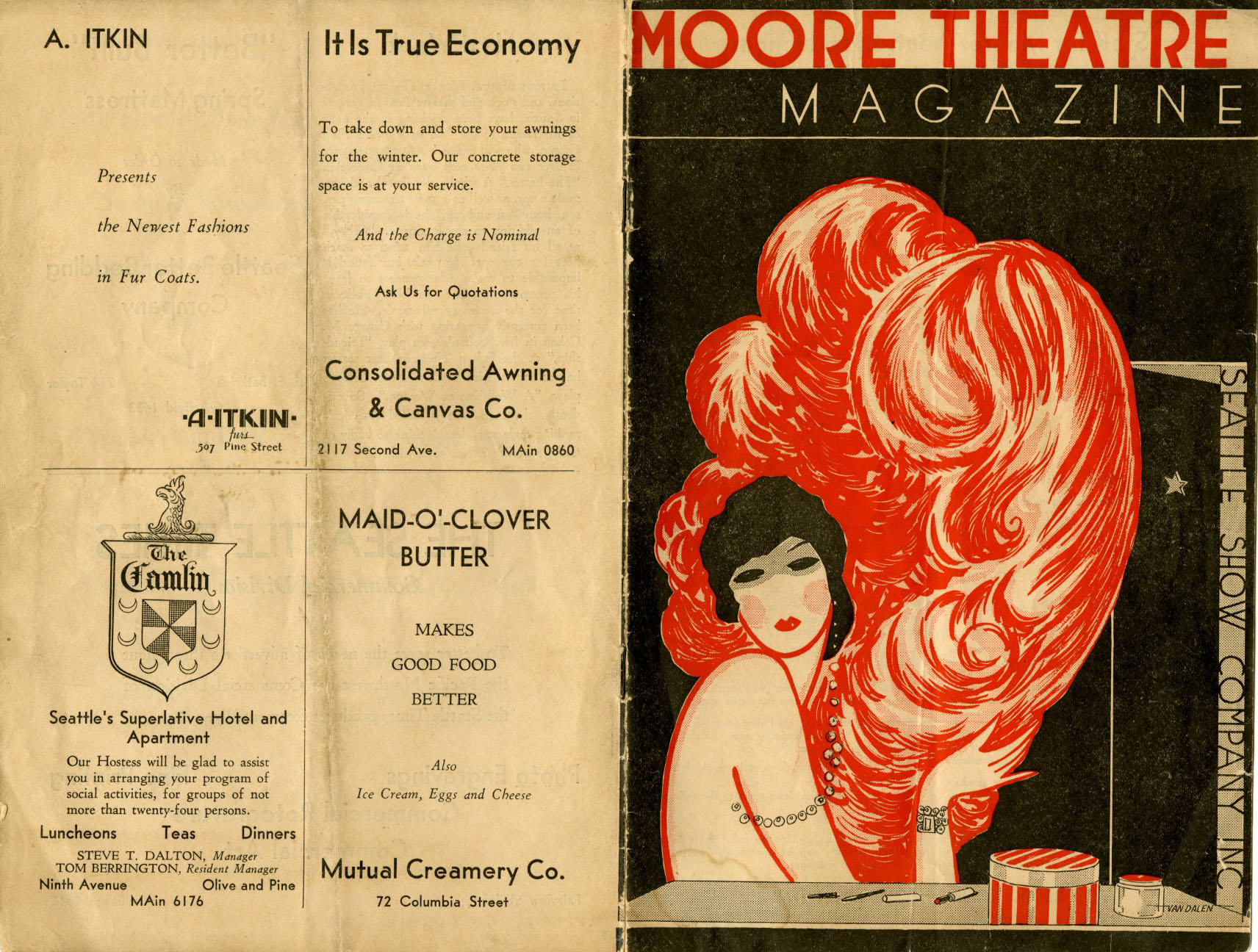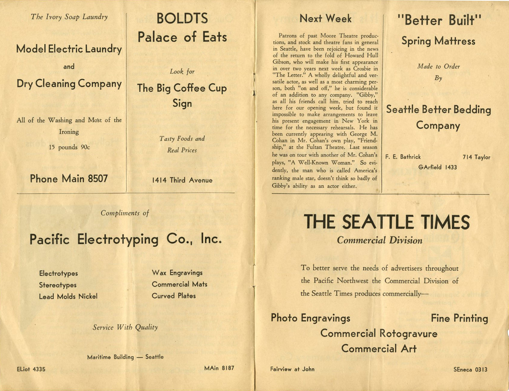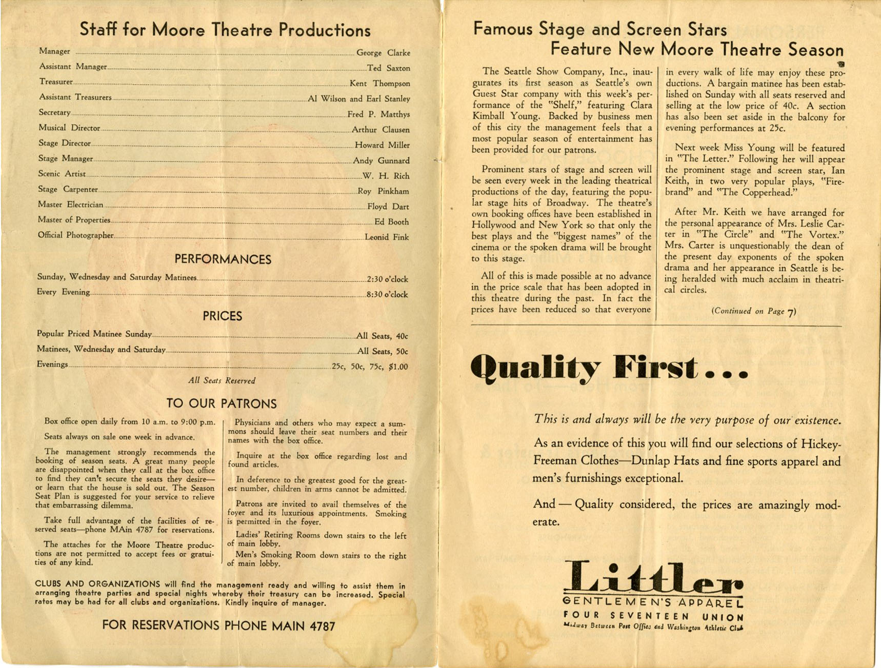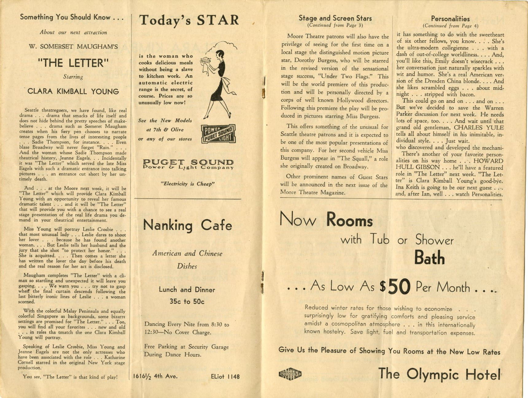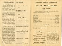 Clara Kimball Young was a guest star of the Bainbridge Players Stock Company at the Moore Theatre in Seattle in 1931. She appeared in The Shelf by Dorrance Davis September 28 to October 3, and appeared as Leslie Crosbie in Somerset Maugham's The Letter from October 4-10. This issue of the Moore Theatre Magazine has the cast listing for the former and a blurb for the latter. These are 6 open-page scans of the whole program, the first being the front and back covers. I also put a PDF of the program in the Internet Archive. | |
