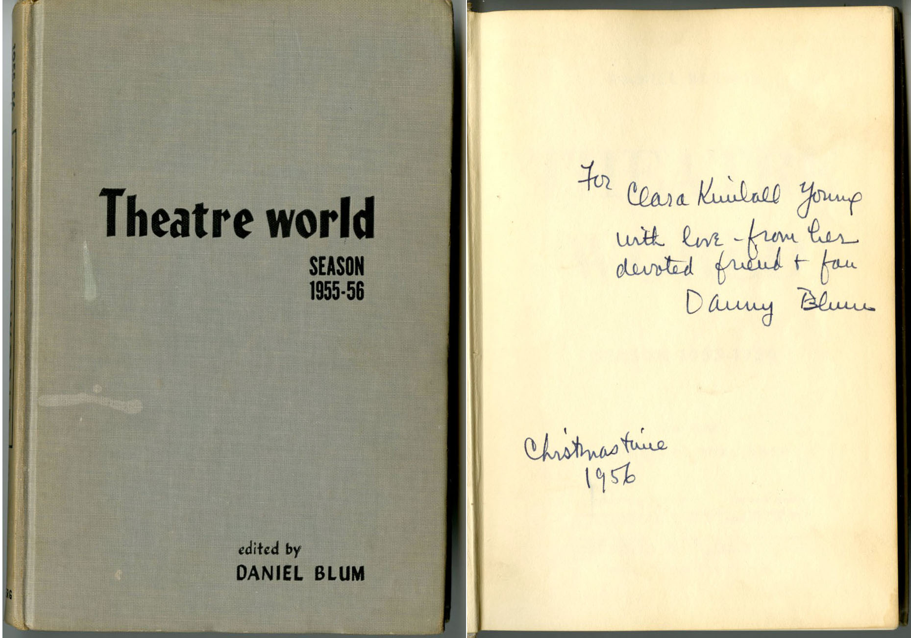For Christmas of 1956, Daniel Blum inscribed a copy of his 1955-56 Theatre World to Clara. Here is the cover and the inscription on the flyleaf, i stitched the two photos together. I got this on eBay. It has an almost unrecognizable picture of William Shatner on page 224. | |