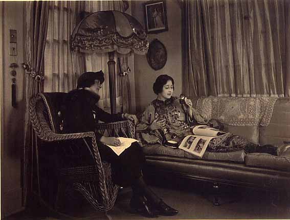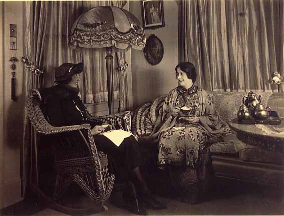 Clara, wearing an embroidered Chinese robe, has tea with a visitor (can anyone identify?) | |