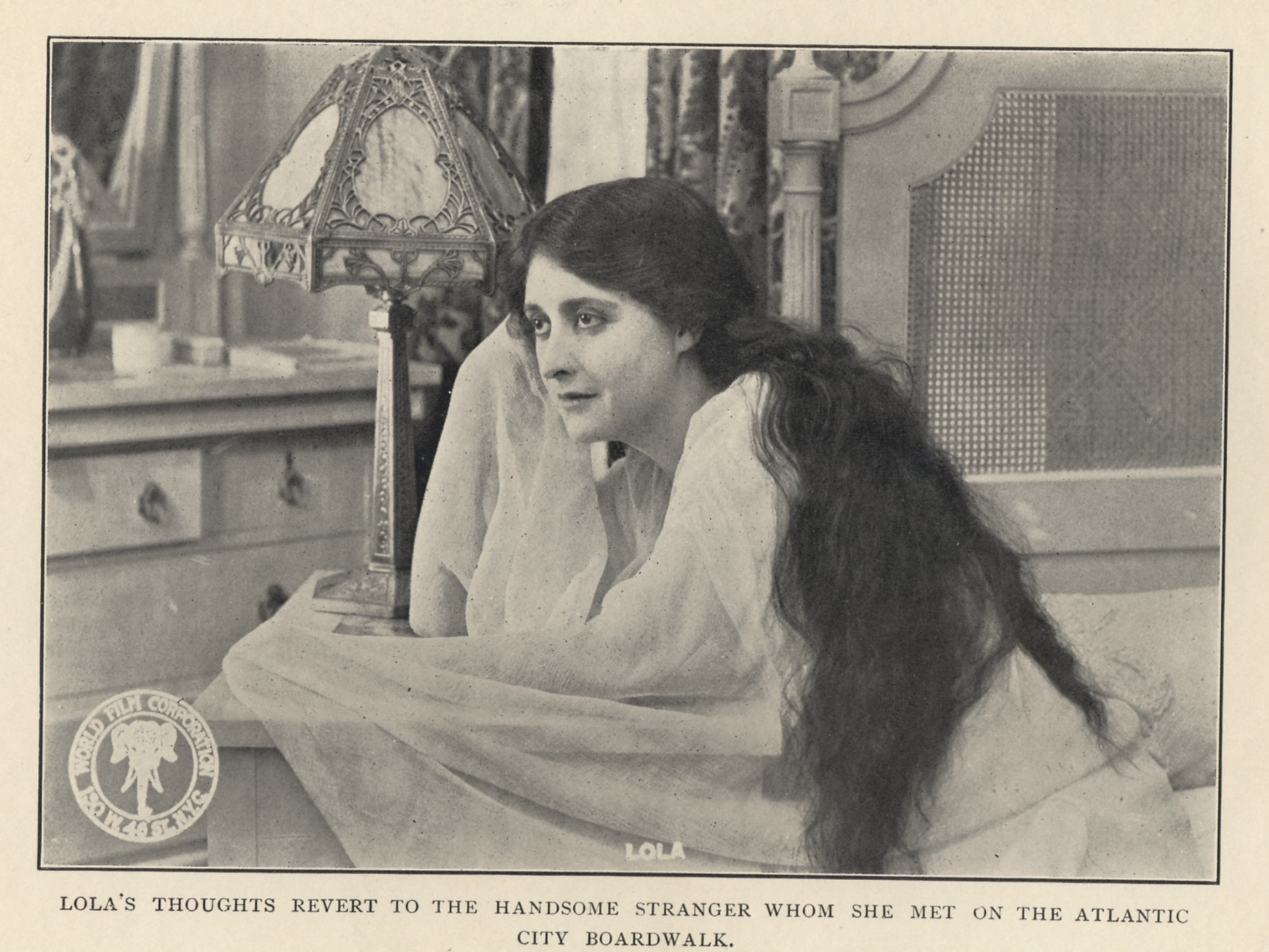 Click on thumbnails for larger viewThe first of the Clara Kimball Young features, to be released by the World Film Corporation this month, is the picture version in four parts by James Young of Owen Davis's play, "Lola." To say that it is daring is putting it mildly, Miss Young's picture of the Jeckyll-Hyde career of Lola Barnhelun along the primrose path is a triumph of pantomimic acting. Two or three of its hectic love scenes double--Cross Victoria and out--Elinor Miss Glyn. On this count the film should be a sensation. One highly spiced episode in Lola's career is an "affair" with an Atlantic City life guard, involving much picturesque lovemaking on the moonlit beach, which is graphic to say the least. Not less vivid was the scene in which Lola sat in her hotel bedroom and went over in her mind these exhilarating passages with the husky life guard, the lamp light playing over her face which pictured her emotions with appealing fidelity. Miss Young handles the scene with the finest skill, but the camera simply will not juggle subtleties. Lola, the sweet and dutiful, is the homebody, caring for her father, a scientist, who has discovered a medical process by which in certain cases life may be restored after the heart for several hours has ceased to beat. Lola is "killed" in a street accident, and, by means of her father's discovery, restored to life. But with the difference that the spirit that made her a warm-hearted, loving woman has fled and she returns to life only a soulless creature of the flesh. She tosses away the love of her former sweetheart, John Dorris, and becomes the mistress of Dick Fenway, who already has a wife. Dick has a bankroll, but Lola's light love refuses to stay put. Hence, the episode of the husky life guard, and later, when Dick's bankroll departs, a transfer of affection and elopement with Dick's millionaire friend. Lola falls ill and is told by the doctors she may die at any minute. Only then does she think of her abandoned father. To him she returns with the demand that when she dies he must bring her back to life for the second time. The answer of the father, who has had time and opportunity to see the evil worked by his discovery, is to send a hammer crashing through the machine that restores life to bodies vacated by their souls. And so Lola falls lifeless for good and all. Trick photography is twice invoked to make the spiritual phase of the tale plain, once when the shadowy semblance of Lola is seen to ascend from her body in her father's laboratory and once again, when she dies finally, the spirit returns to view its one-time tenement. The film aims at no scenic effect, probably with intent. All the back grounds are simple to the degree of bareness. In the same way the distance never varies, with the result that the figures come upon the screen in exact life size. The effect of this is to concentrate attention on the people of the story, their character evolutions, and thus upon the development of the psychic theme itself. Whether that was the intention or not, it was the effect. The story is interesting, the acting exceedingly well done and the "punch" delivered with stunning force. Miss Young's lady Frankenstein is very likely to start something in filmdom.