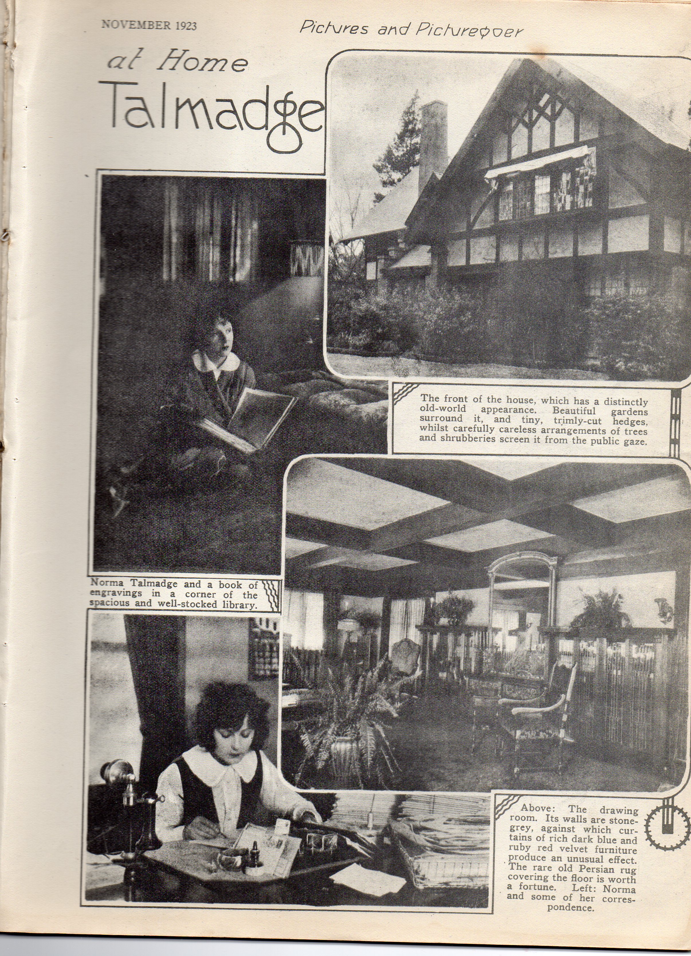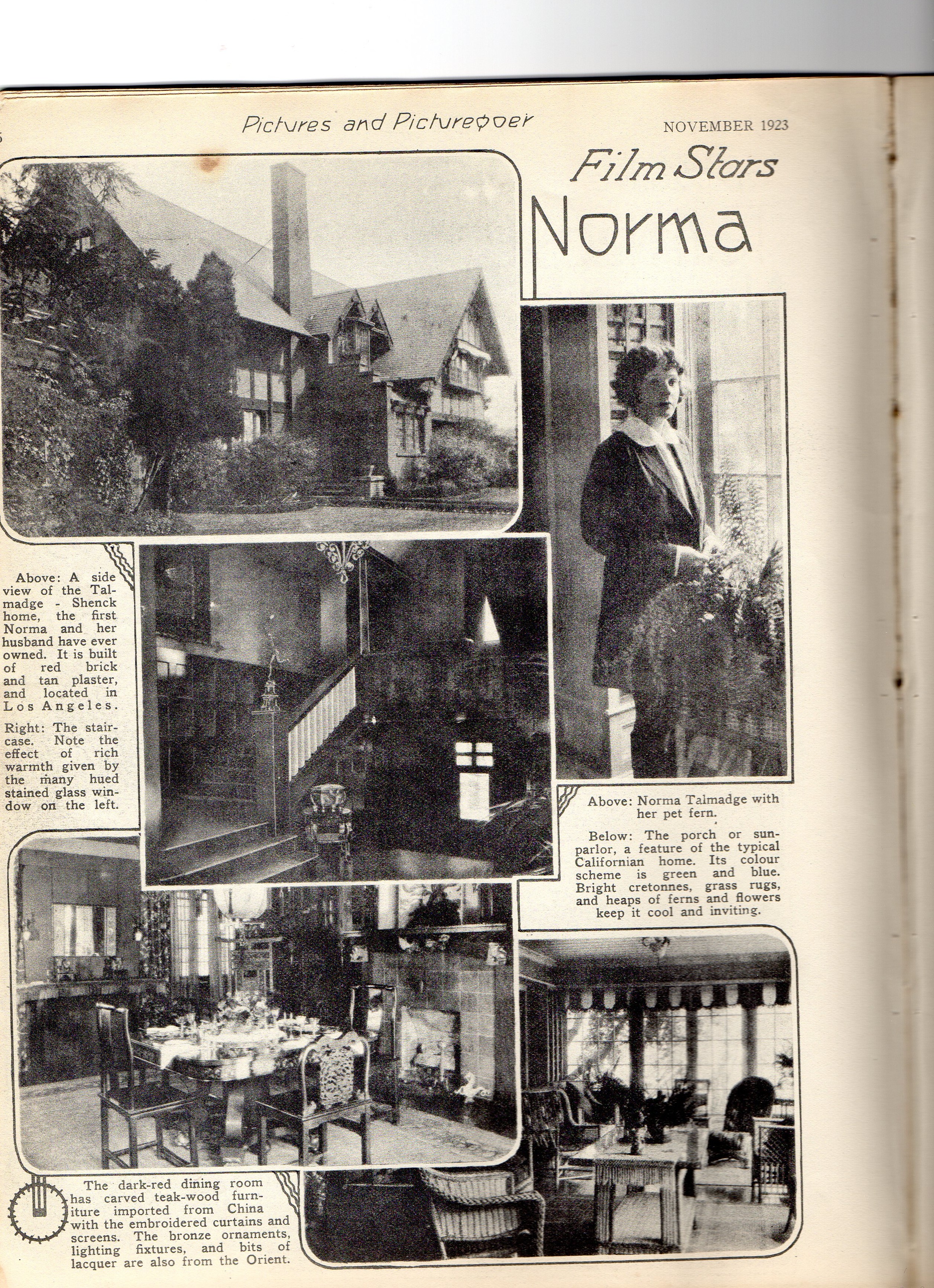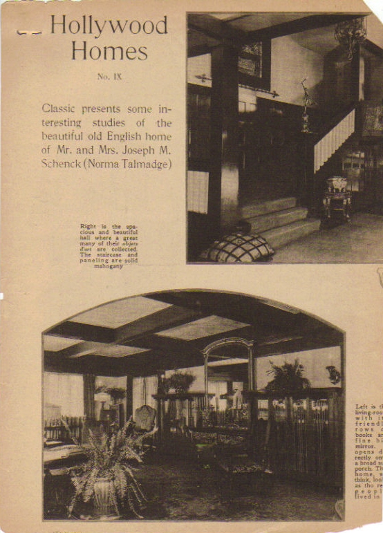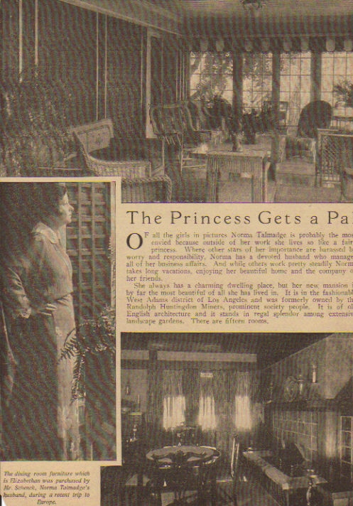 649 West Adams Street, Los Angeles, a house with other famous occupants (courtesy of Silents Are Golden) (early 1920s). This is now called Randolph Huntington Miner House and is a L.A. Historic Cultural Monument. Below are some clippings with interior views (the last 2 courtesy of Joan Myers, from the British journal Picturegoer , November 1923). Despite the magazine spreads, they cannot have lived here for long, if at all. According to the County Assessor's records, Joe Schenk took the deed in October 1921, and sold it to Edward Doheny, Jr. on January 9, 1922, who either sold it or donated it to the Catholic church in 1925 (thanks to Joan Myers for this info too!)