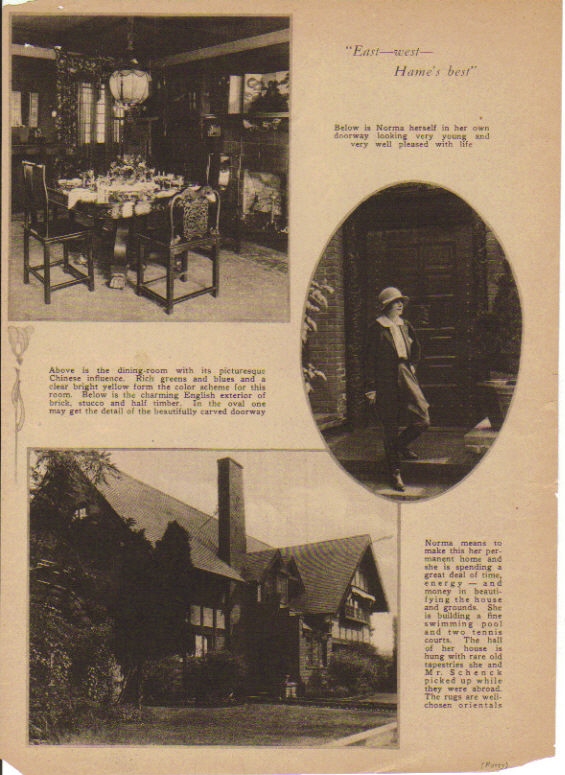 7269 Hollywood Blvd, Hollywood (also known as the Cudahay Mansion.) A 1925 report said that Norma and her husband had "reopened their home on Hollywood Blvd.", and she was reported as living on Hollywood Blvd. in 1927. It was torn down sometime after Schenck sold it in 1940. Click thumbnail for a larger view. Here is an interesting article on the house by Allen Ellenberger