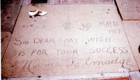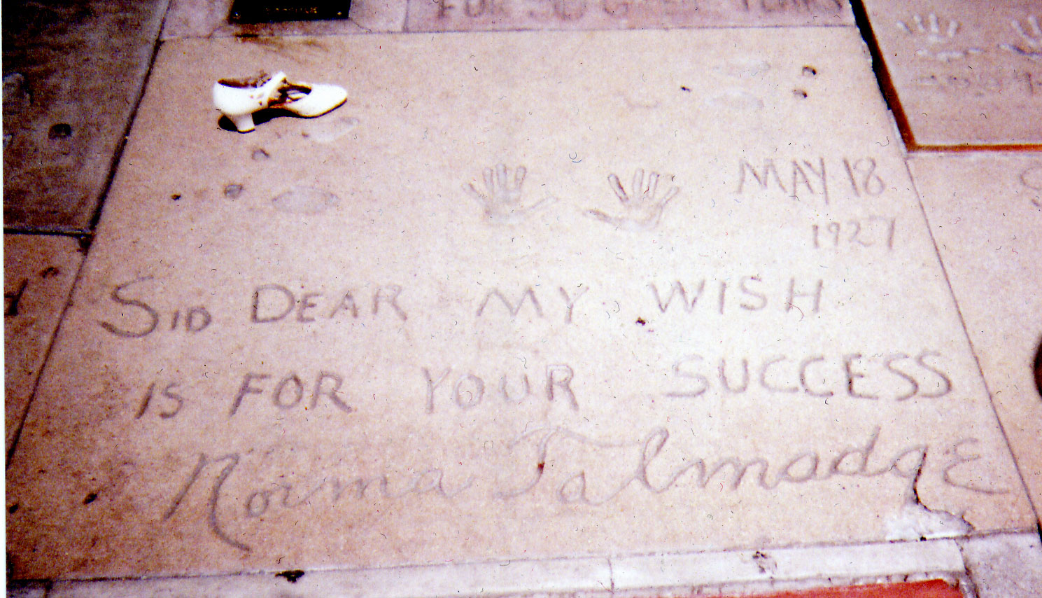Grauman's Chinese Theatre on Hollywood Blvd. (Now Mann's Chinese Theatre) Norma Talmadge turned the first spade of dirt at the groundbreaking ceremony in 1926 (which was captured for newsreel cameras), and legend has it that she accidentally stepped in some wet cement. That gave Sid Grauman the idea for the stars' footprint that have been the theatre's hallmark ever since. Norma's formal footprints and signature were the third official footprints, after Mary Pickford and Douglas Fairbanks. Click thumbnail for a larger view of Norma's footprints and signature (shown for comparison with a size 7 1/2 shoe from the 1930s).