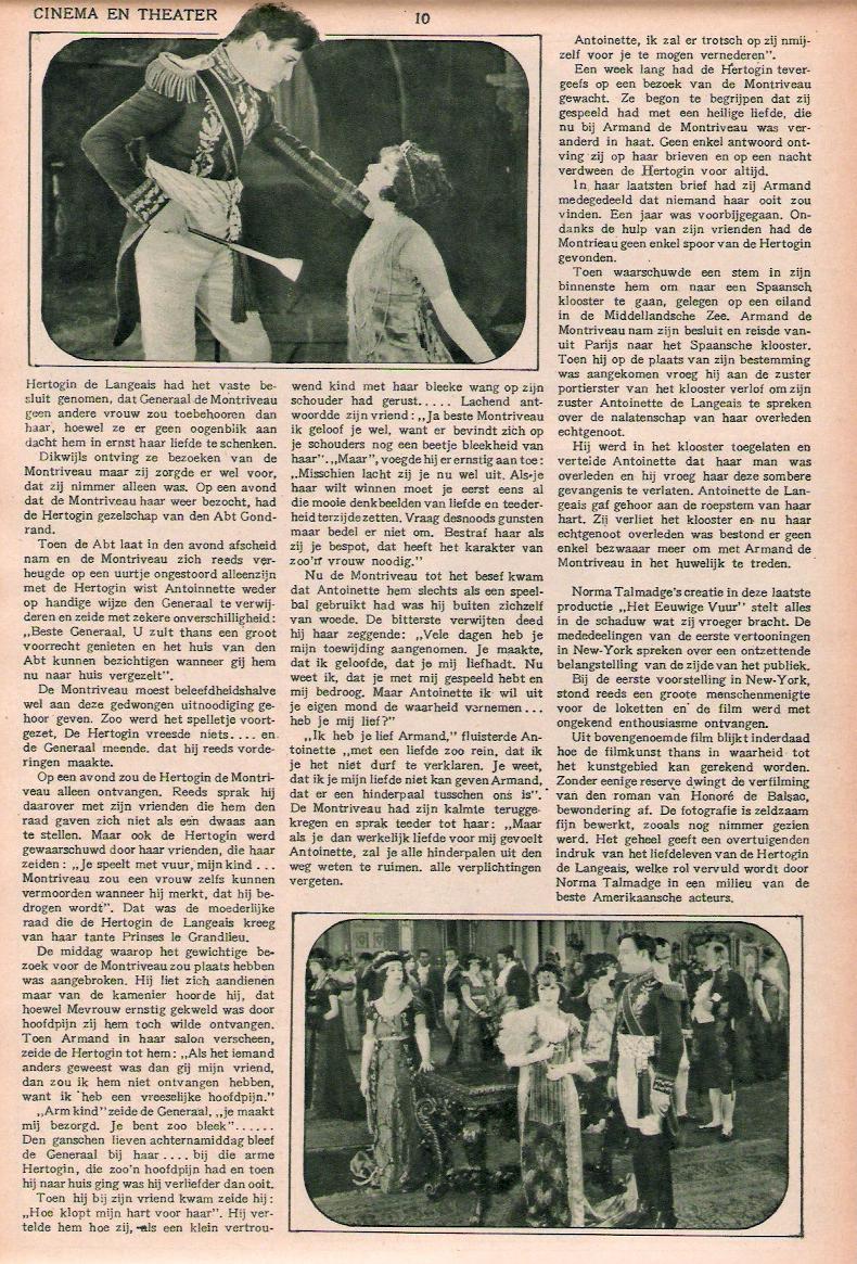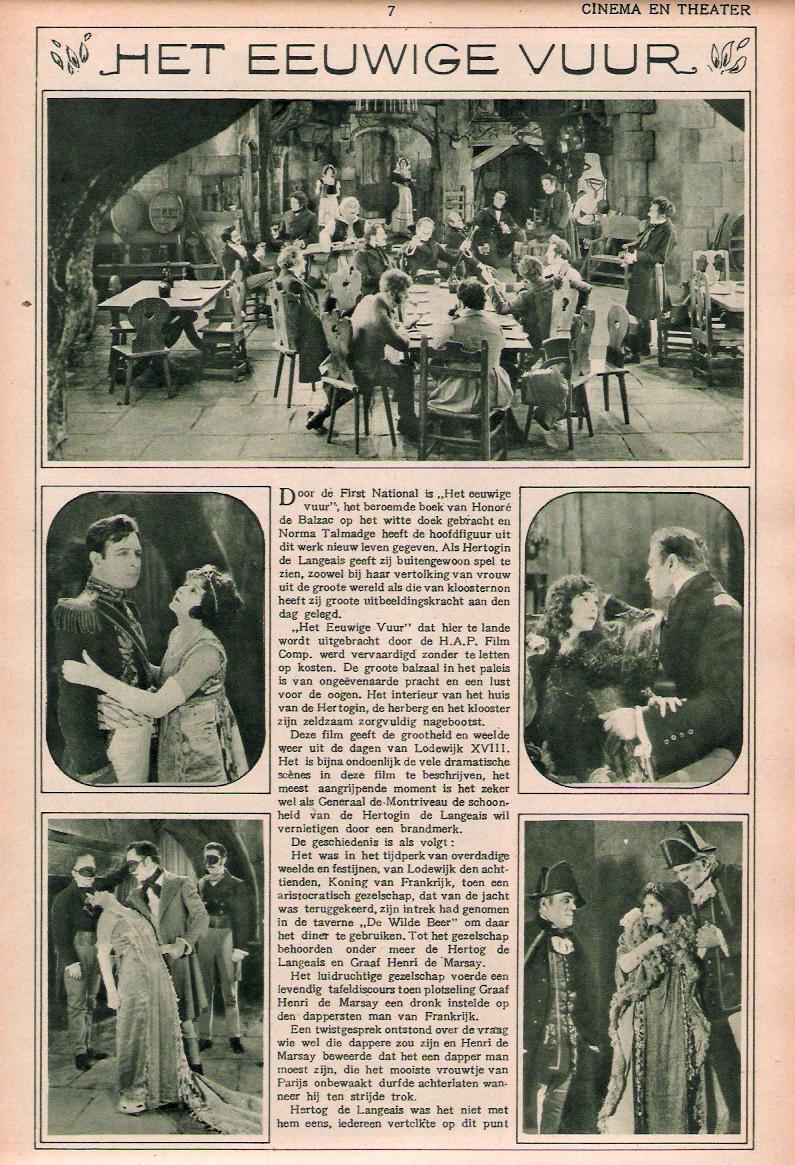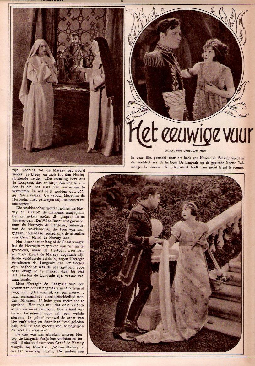 For some reason, best known to the producers, this picture is being compared with "Smilin' Through." It is not as sentimental as that Talmadge success, but it is a greater, bigger, and even finer production. "Smilin' Through" made them weep; "The Eternal Flame" will send them out of the theatre boosting. There is nothing left undone an no opportunity in Honore de Balzac's famous novel, "La Duchesse de Langeais," has been overlooked.