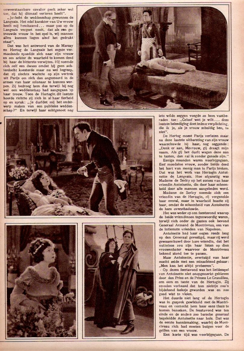 It is unquestionably a fine picture, because it presents the always competent Miss Talmadge with an excellent story, intelligent direction and an unusually good supporting cast. The scenario, by Marion Fairfax [i.e. Francis Marion], is an adaptation of Balzac's novel, "La Duchesse de Langeais," and while Miss Fairfax has translated rather freely from the original French, one is compelled to concede that she was justified in doing so. The earlier reels of the picture are littered up with epigrammatic sub-titles, which are somewhat more reminiscent of The Smart Set than of Balzac, but this is fortunately only a passing phase. After Miss Fairfax has exhausted the world's supply of machine-made witticisms, the language of the sub-titles comes down to normal.