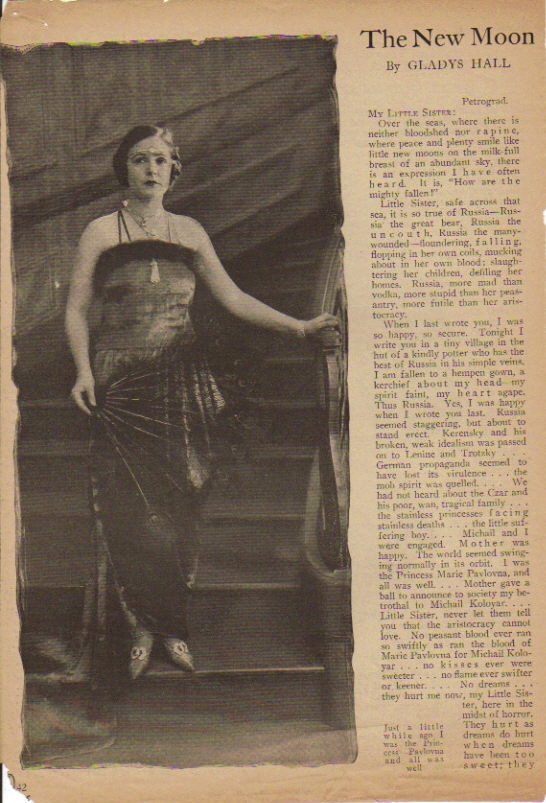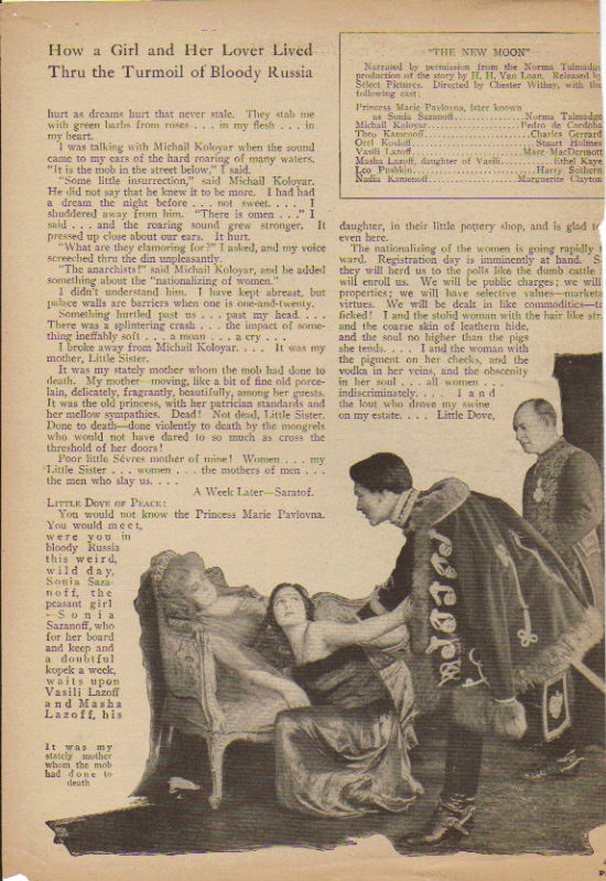 A real old-fashioned meller, of the up-raising of the Bolshiviki and the reign of terrorism inaugurated by the Reds in Russia form the basis of "The New Moon" in which Norma Talmadge is presented by Joseph M. Schenck. The story was written by H.H. VanLoan. Although Miss Talmadge looks wonderful as a Russian Princess and does some very remarkable work in the role of the story, it is hardly the type one would expect to see her in. It is so cheaply melodramatic that it smacks rather of the Eighth avenue type than Broadway.