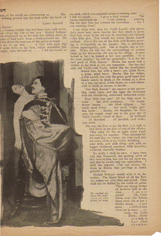 At her store Marie is accidentally recognized by unscrupulous Kamenff, now in love with her, though she does not know him. He issues a mandate that all females between 17 and 32 must register, and Marie does so under her assumed name, supposing it is for good work. The women are undeceived when they find a second mandate makes them national property at the disposal of men. They appeal to Marie at a moment when Kameneff is within hearing. She says she will appeal to Kameneff. Once she is alone he reveals his identity and offers to revoke the order if she will live under his protection, only to be denied with spirit. There is now an orgy of brutality. Kosloff ruins the daughter of Lazoff, the potter, and Lazoff becomes an instrument of vengeance when joined by Michail, who has been told that Marie is the mistress of Kameneff. He reads her innocence in her eyes, and goesto her rescue when she is arrested and taken to Kameneff's headquarters. Lazoff chokes brutal Kosloff, and his hand aims the pistol that kills Kameneff, the latter having executed a group of women, his own sister in the number. Michail and Marie escape at lst, to enjoy new freedom and true happiness, though betrothed under the unlucky full moon. [sic, nobody seems to be able to get their astronomy right]
