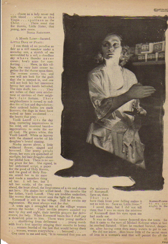 Advertising Angles. Make all the use you can of Miss Talmadge's name. Play up the story as the first romantic play dealing with the new Russia and its ghastly evils. Use the line "Not a war story, but a story of Russia after the war," to carry home the fact that this is not a left over from pre-armistice days.