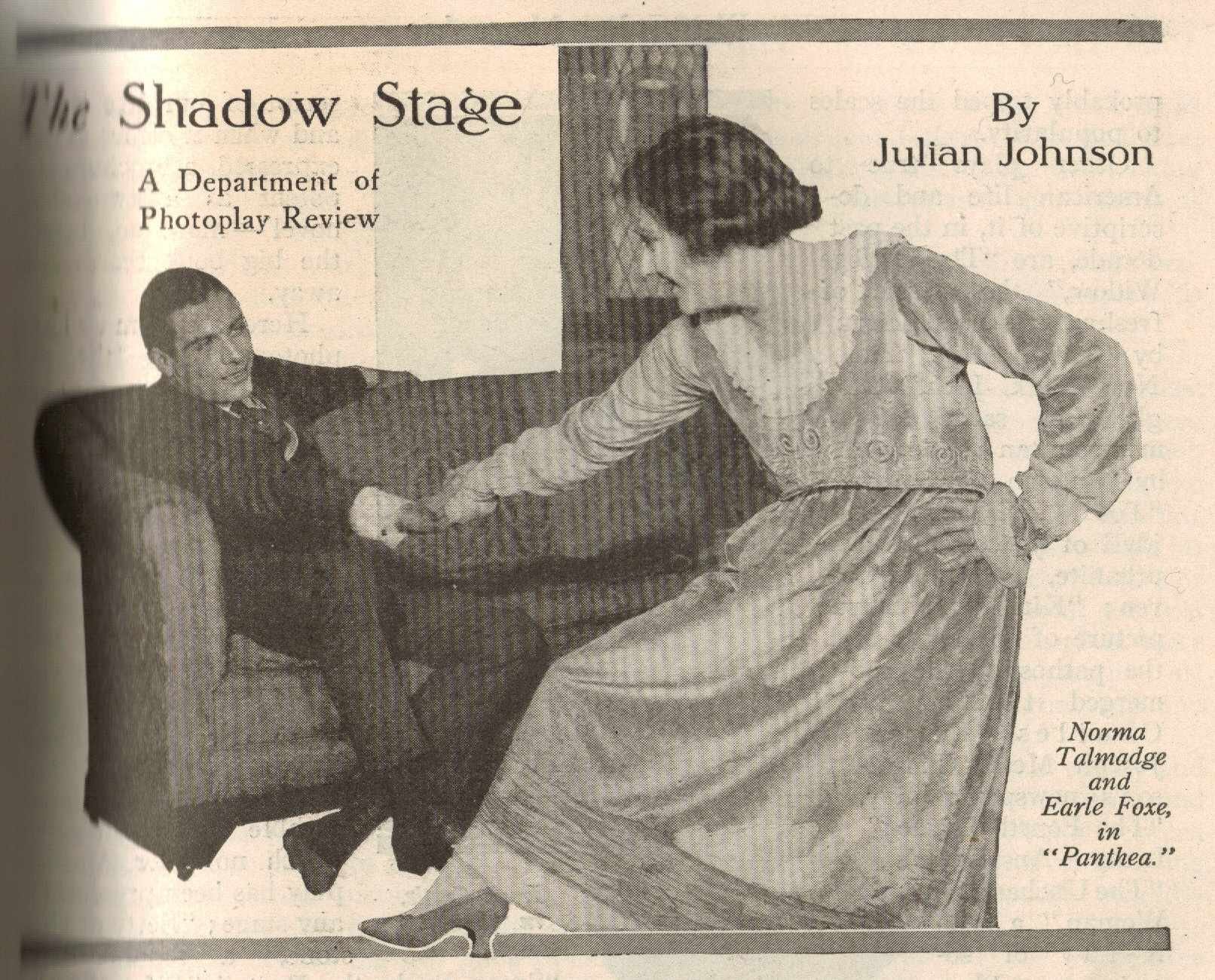 PANTHEA (Five Parts--December.--The cast includes Norma Talmadge, Roger Lytton, George Fawcett, Earle Fox, Murdock McQuarrie, Count E. Von Stroheim, Norbert Wicki, Herbert Barry, Jack Meredith, Henry Thorpe, William Abbington, Winifred Harris, Ieleen Pelsey, Stafford Windsor, William Lloyd, Dick Rosson, Frank Currier and J.S. Furey. Directed by Allan Dwan