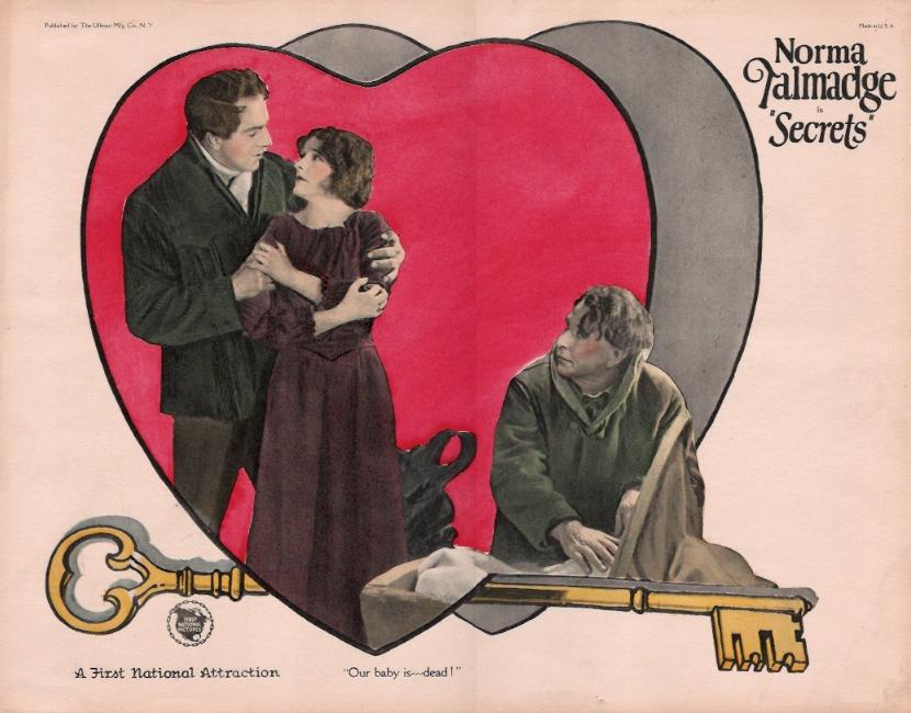 SECRETS--First National. Married life is made up of secrets--of moments that are hidden away in the silent places of the heart. The poignant secrets of one marriage have been revealed in this picture--with Norma Talmadge as the wife and Eugene O'Brien as the husband. The story is reflected back, across the years, from the pages of a diary--held in the withered hand of a woman who is waiting to hear of her husband's death.