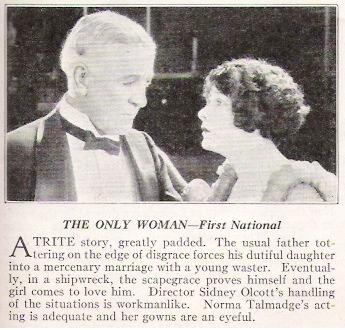 If it wasn't for Norma Talmadge being the star of this production and if it hadn't been directed by Sidney Olcott, "The Only Woman" would be a typical small timer. The story by C. Gardner Sullivan is one especially written for the screen. It is an old told tale oft told in the movies and minus a single new angle. When it starts one knows immediately the finish. With Norma Talmadge the picture will get some money at the box office, but it is certain that Miss Talmadge can't go along with pictures of this sort and hold her place.