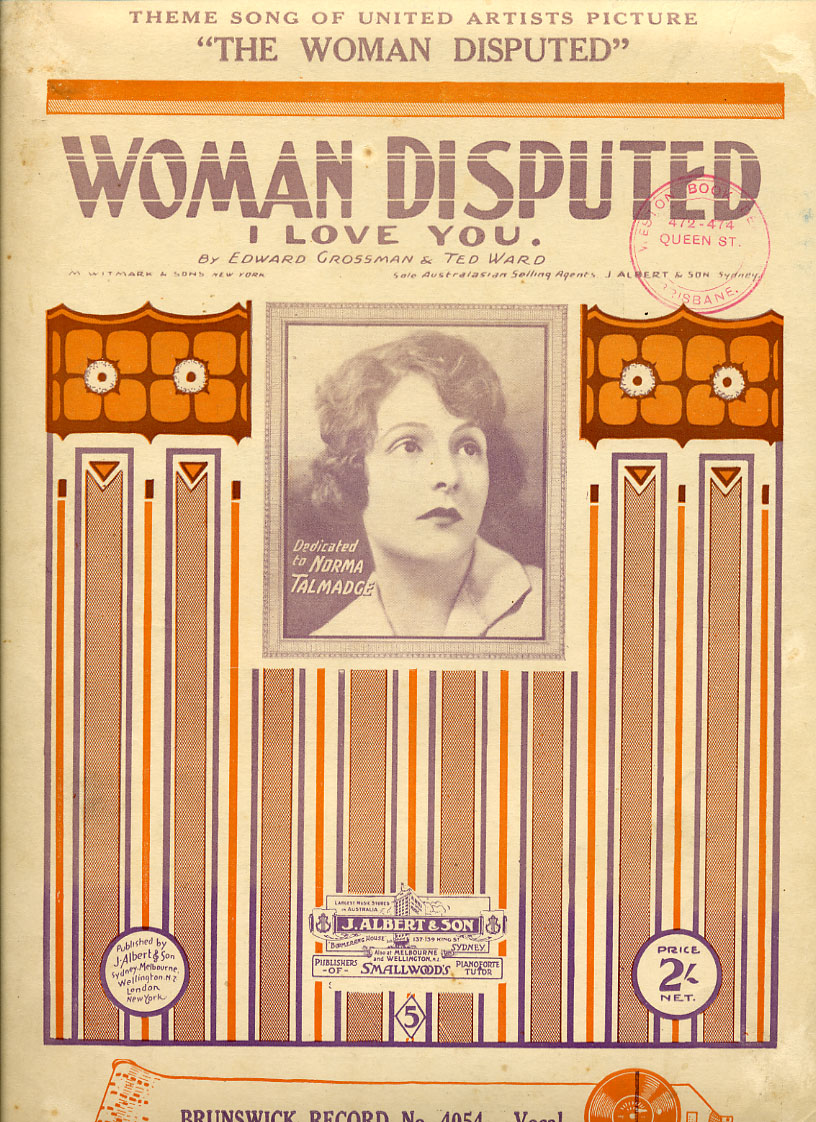 to listen to an excerpt of a damaged disc by The Gennett Concert Orchestra with a male soloist, recorded in 1928. Thanks to Jeff Cohen at the Vitaphone Varieties blog for permission to mount a copy of this recording. The existing print of the film lacks the music track. Note that neither the recording nor the sheet music contain the phrase: "though you're refuted, woman disputed I love you." This story came from Alexander Walker's The Shattered Silents, p.82, though he did not cite his source. Another movie urban legend bites the dust!