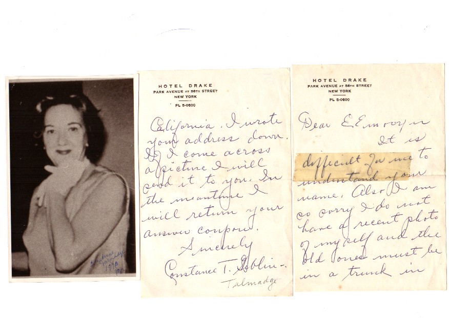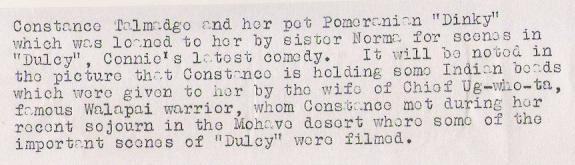 To the left is a publicity picture from Dulcy and the snipe on the back. Constance is with Norma's dog Dinky. At the right is a detail of another still from the picture with Dinky on Constance's lap. |