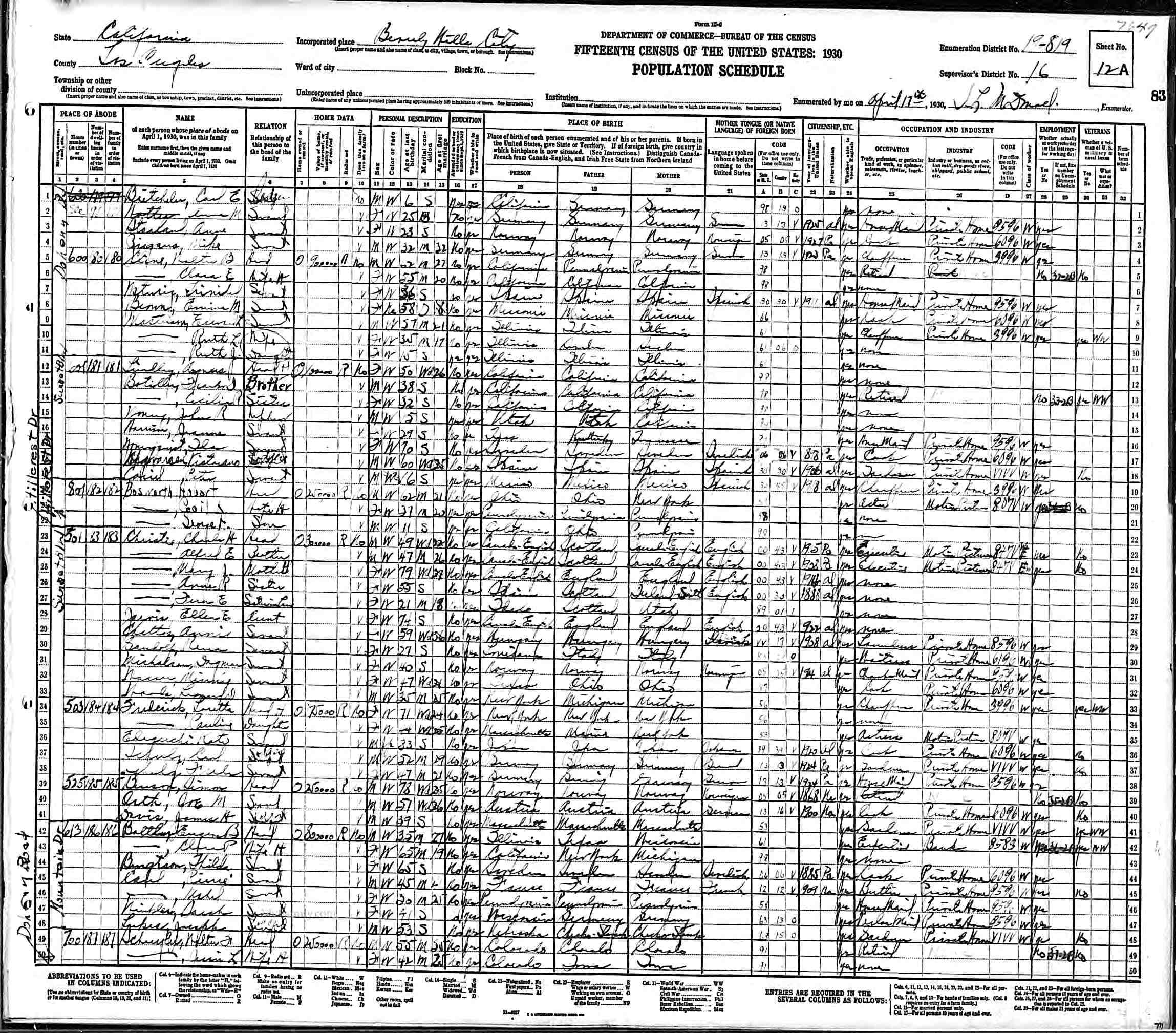 | 9419 Sunset Blvd, Beverly Hills. Muriel Elwood's book gives the address as 503 Sunset. Frederick bought this in 1920 or 1921 when it was still a fairly undeveloped part of town. Rudolph Valentino met Jean Acker here (hence the above link to the Valentino Forever site). The home was apparently sold to Irving Thalberg in 1927, and he married Norma Shearer there. Or perhaps they only rented it since Frederick and her mother are here in the 1930 census. This is said to adjoin the Doheney Estate but perhaps that property was larger in earlier years because it is now a couple streets away from Greystone Mansion.. | |