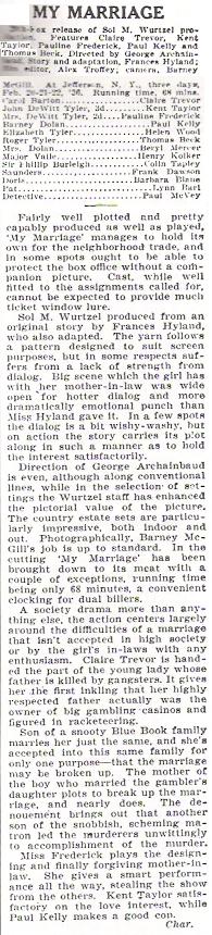 My Marriage (1936) 20th Century-Fox. Producer: Sol M. Wurtzel. Director: George Archainabaud. Writer: Frances Hyland. Photography: Barney McGill. Editor: Alex Troffey. Cast: Claire Trevor, Kent Taylor, Pauline Frederick, Thomas Beck, Helen Wood, Colin Tapley, Paul Kelly, Henry Kolker, Frank Dawson, Lynn Bari, Paul McVey. Daughter of a racketeer finds her marriage to a society boy opposed by his snooty mother. Frederick is chilling as the deceptively friendly mother in law who pretends to accept Trevor, while working to break up the marriage behind her back.