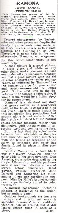 Ramona (1936) 20th Century-Fox. Producer: Sol M. Wurtzel. Director: Henry King. Writer: Lamarr Trotti. Photography: William V. Skall. Editor: Alfred DeGaetano. Art Director: Duncan Cramer. Costumes: Gwen Wakeling. Cast: Loretta Young, Don Ameche, Charles Waldron, Kent Taylor, Pauline Frederick, Pedro de Cordoba, Jane Darwell, Catherine DeMille, Victor Kilian, John Carradine, J. Carrol Naish, Claire Du Brey, Russell Simpson. Woman, brought up in a Spanish California rancho with a chilly matriarch, marries an Indian man and encounters many tribulations. This film airs occasionally on television. Frederick is dominant in the early part of the film as the proud and snobbish mother of the heir to the ranch, who has brought up Ramona but dislikes her. This is her only film in color.