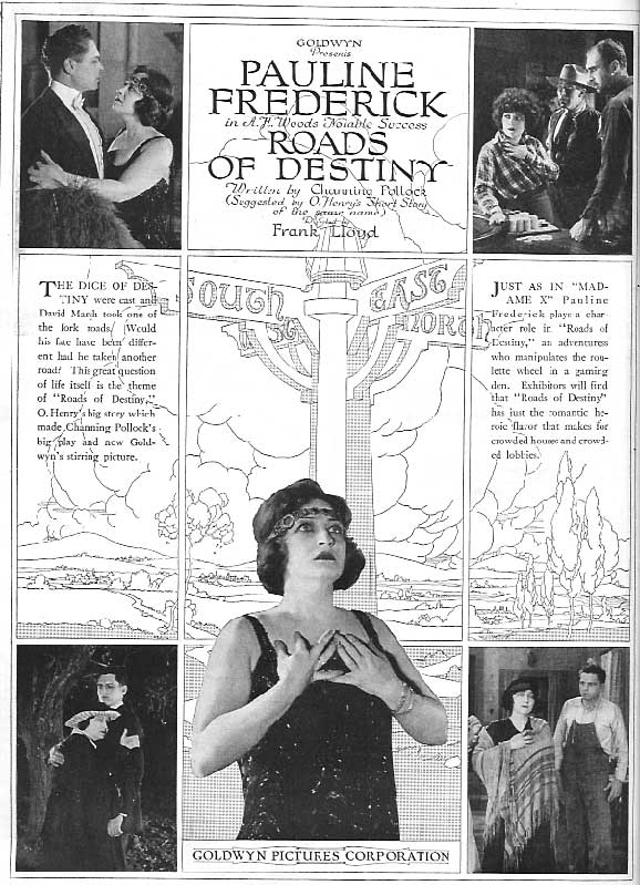 Roads of Destiny (1921) Goldwyn Pictures Corp. Director: Frank Lloyd. Scenario: J. E. Nash. Camera: J.D. Jennings. Cast: Pauline Frederick, John Bowers, Richard Tucker, Jane Novak, Willard Louis, Maude George, Maurice B. Flynn. In real life and three dream sequences in different locales, betrayed woman cannot escape her fate. 5-6 reels. LOST