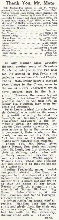 Thank You, Mr. Moto (1937) 20th Century-Fox. Producer: Sol M. Wurtzel. Director: Norman Foster. Writers: Wyllis Cooper, Norman Foster. Photography: Vergil Miller. Editors: Nick DeMaggio, Irene Morra. Art directors: Bernard Herzbrun, Albert Hogsett. Costumes: Herschel McCoy. Cast: Peter Lorre, Pauline Frederick, Thomas Beck, Jayne Regan, Sidney Blackmer, Sig Rumann, John Carradine, Nedda Harrigan, Philip Ahn. Mr. Moto tries to get some scrolls owned by a Chinese woman and her son before the villains get to them. This film airs occasionally on television. In her last film, Frederick plays a contemptuous but courageous matriarch who is tortured to death rather than reveal the whereabouts of the scrolls.