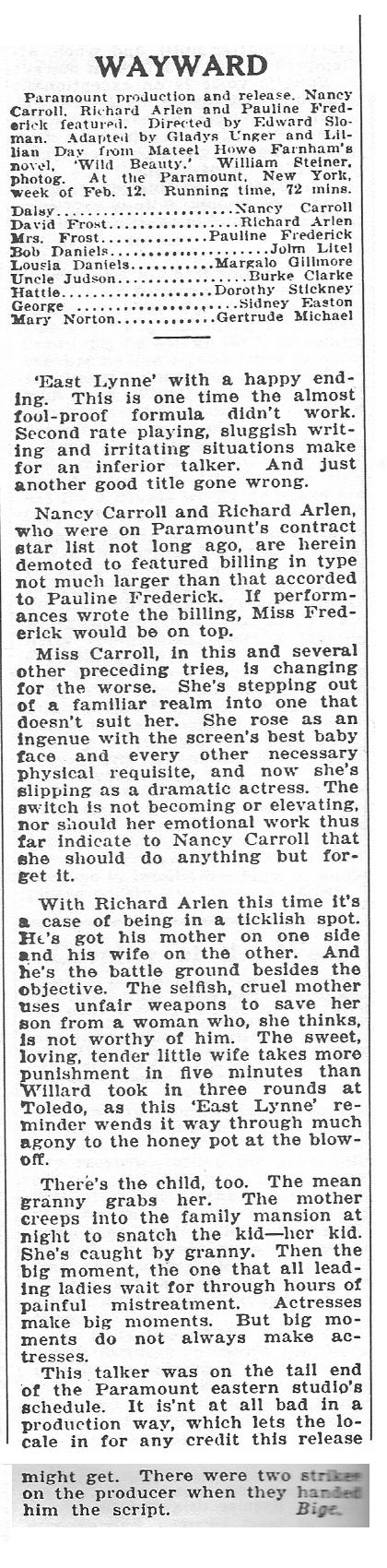Wayward (1932) Paramount. Director: Edward Sloman. Writers: Lillian Day, Gladys Unger. Photography: William O. Steiner. Editor: Arthur Ellis. Cast: Nancy Carroll, Richard Arlen, John Litel, Margalo Gilmore, Dorothy Stickney, Gertrude Michael. Possessive mother tries to break up her son's marriage to a cabaret dancer. Strong performances by Frederick and Nancy Carroll mark this competition between wife and mother in law for possession of the son. Probably Frederick's most unsympathetic role.