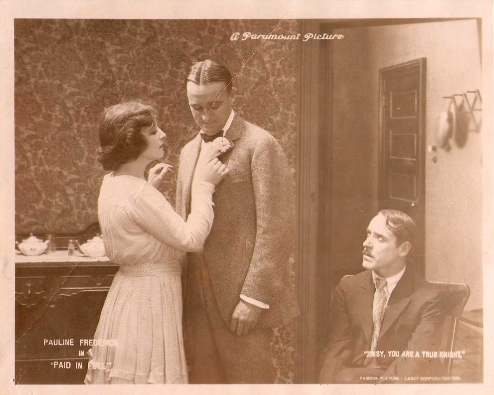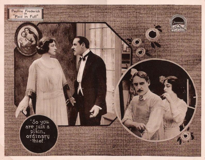 Paid in Full (1919) Famous Players-Lasky Corp. Distributor: Famous Players-Lasky Corp; Paramount Pictures. Presenter: Adolph Zukor. Director: Emile Chautard. Scenario: Charles E. Whittaker. Camera: Jacques Bizeul. Cast: Pauline Frederick, Robert Cain, Wyndham Standing, Frank Losee, Jane Farrell, Vera Beresford. 5 reels. This film appears to be LOST